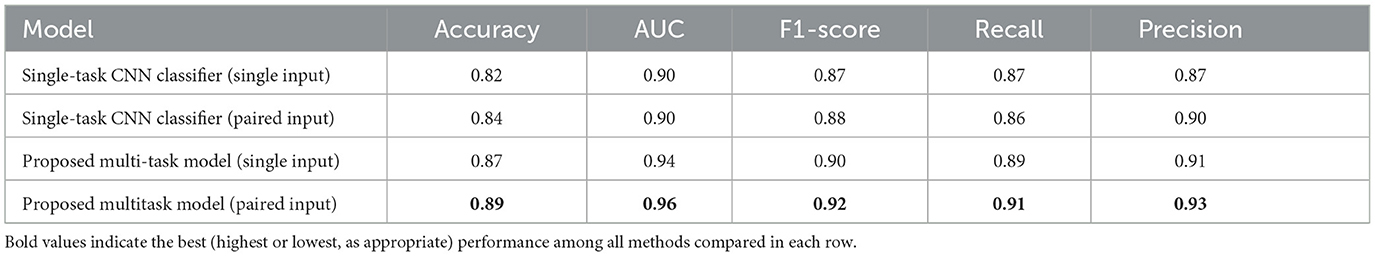 The classification performances are summarized in Table 5. The proposed model outperformed the single-task CNN model in all metrics, including accuracy, precision, recall, and F1 score, demonstrating the benefits of deeper feature extraction and regularization. These results underscore the value of advanced neural architectures in improving ABR signal classification. For both models, the paired-input version produces better results compared to the single-input version.