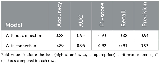 A regular multi-task network has a common backbone followed by multiple separate heads. In this work, we investigated a variation where there is sharing in the intermediate layers. Specifically, as shown in Figure 5, an intermediate tensor from the regression head is fed to the classifier head, transferring important features. This, in effect, reduces the need for a more complex classifier head and leads to better performance with limited data. We tested connections from different intermediate levels and achieved the best performance when low-level features were transferred. The network is trained with and without the connection, and the results are shown in Table 6.