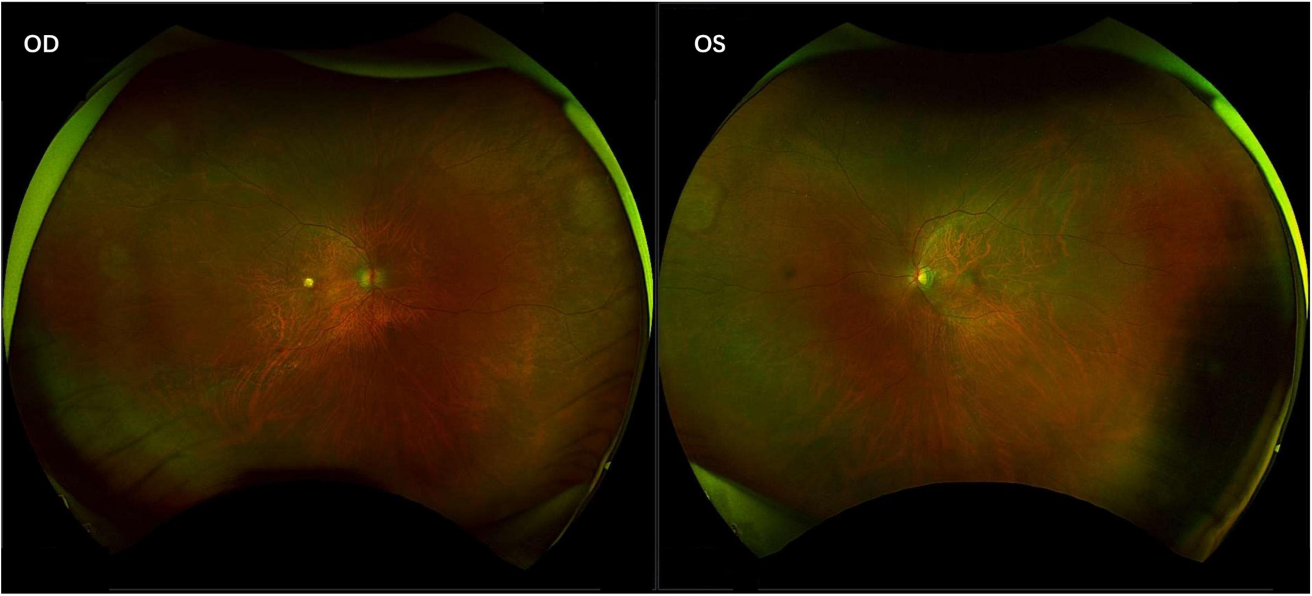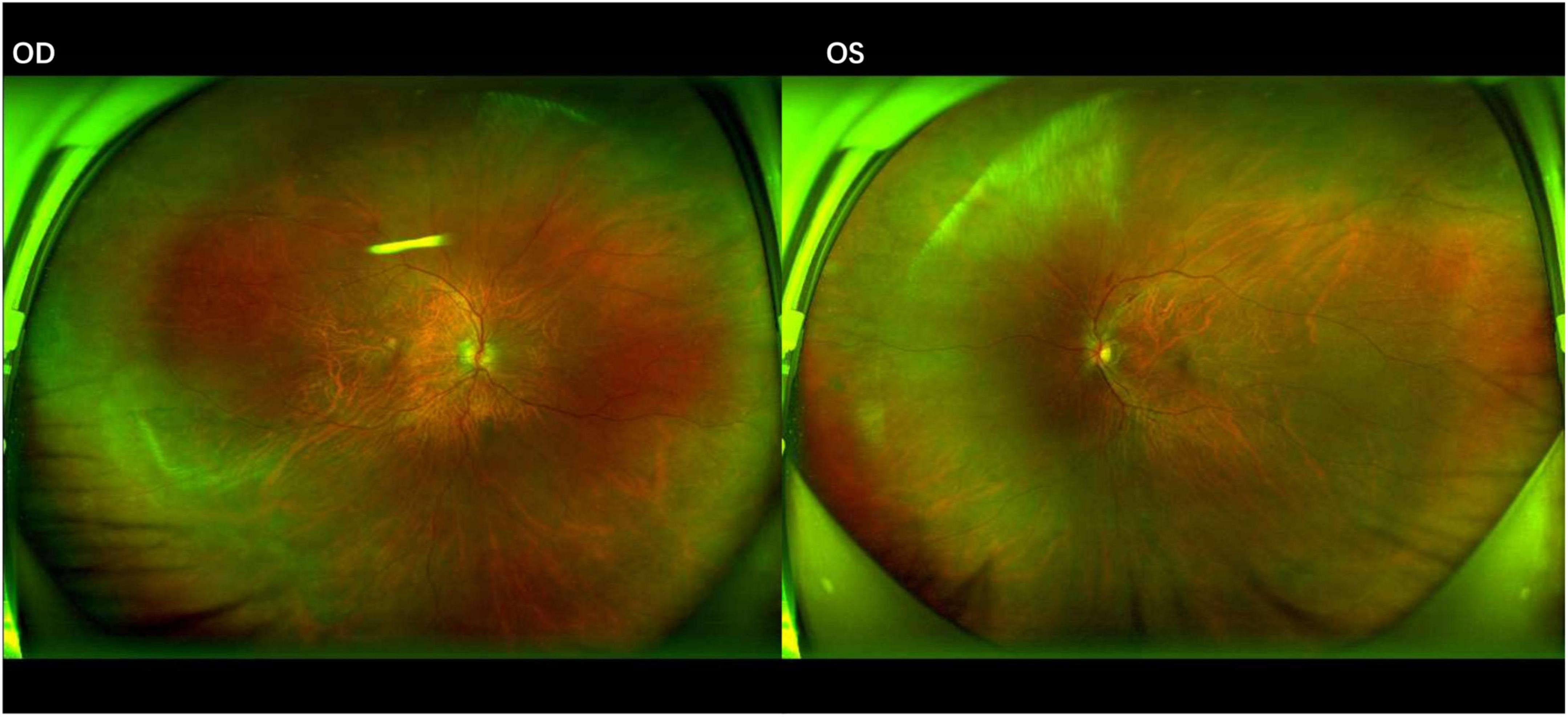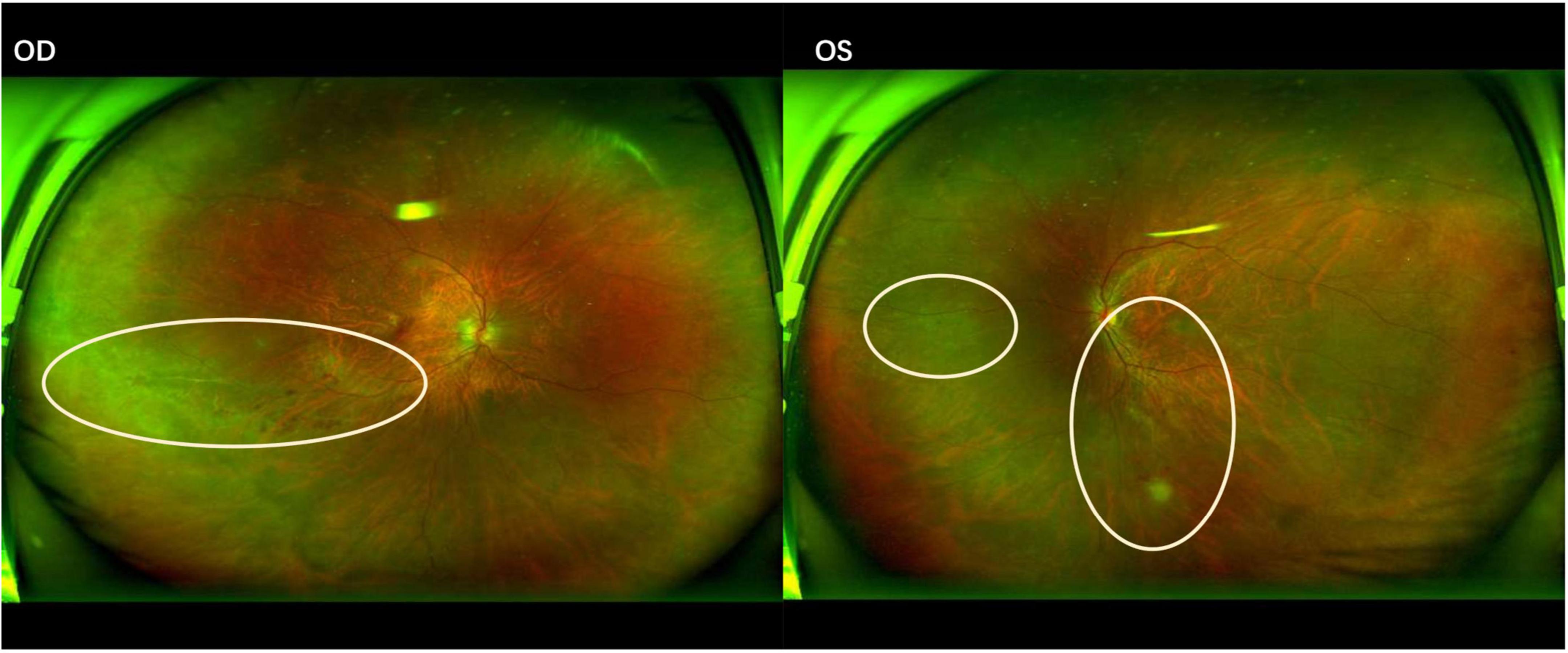 Figure 1. Fundus photograph of cytomegalovirus retinitis demonstrating a “hemorrhagic” appearance with lesions spreading centrifugally along the vascular arcades. OD (Right eye): Yellow-white necrotic lesions with associated retinal hemorrhages are present inferior to the optic disc. OS (Left eye): Yellow-white necrotic lesions and retinal hemorrhages are observed superior to, inferior to, and temporal to the optic disc.