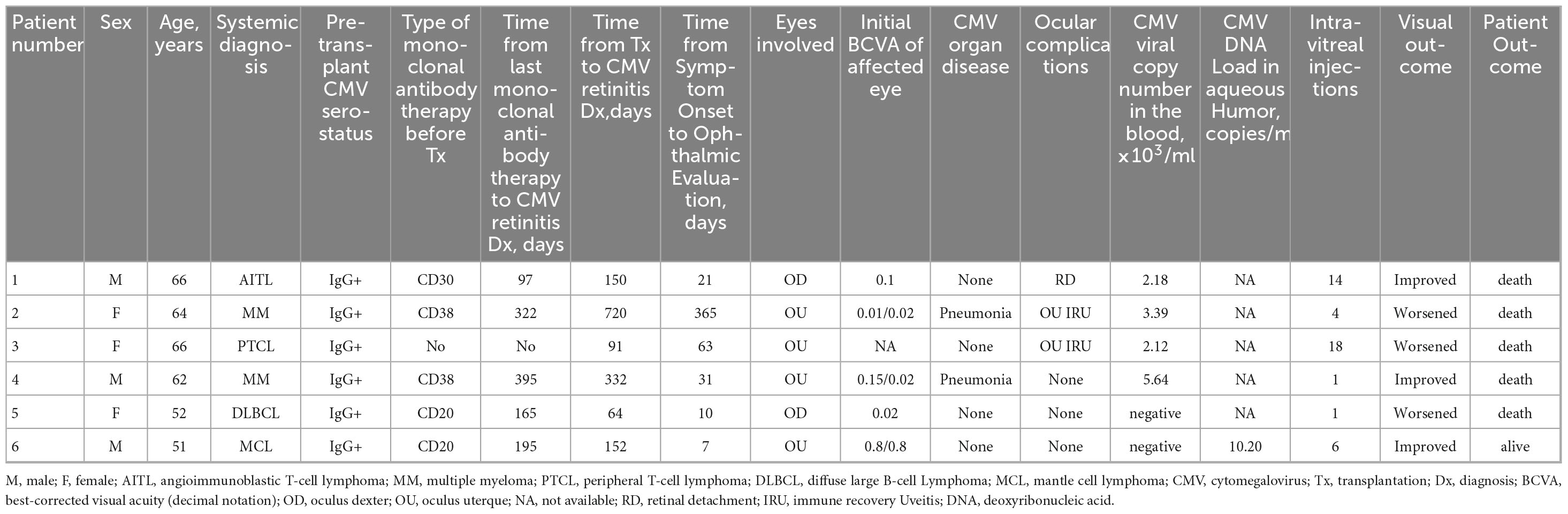 Table 1. Clinical characteristics and outcomes of six patients with cytomegalovirus retinitis after transplantation.