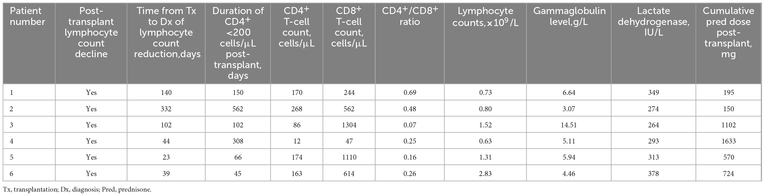 Current guidelines indicate that extensive use of mAbs and high-dose corticosteroids (>20 mg prednisolone per day, ≥14 d of continuous or cumulative exposure) may contribute to the development of CMV retinitis (3). In this cohort, 83.33% patients received pre-transplant mAb therapy targeting CD30, CD38, or CD20. The median interval from the last dose of monoclonal antibody therapy to the diagnosis of CMV retinitis was 195 days (range,97–395 days). Notably, 66.67% patients received high-dose corticosteroids, with cumulative exposure calculated as the total prednisone-equivalent dose (mg). Such immunosuppression impairs lymphocyte proliferation and function, reduces the CD4+/CD8+ ratio, and delays immune reconstitution. Laboratory characteristics at diagnosis are summarized in Table 2. Prior to the diagnosis of CMV retinitis, lymphocytopenia (<1.50 × 109/L) persisted for a median of 73 days (range, 23–332 days). At the time of diagnosis, the median absolute lymphocyte count was 1.06 × 109/L (range, 0.63–2.83 × 109/L). Mild lymphopenia (≤0.8 × 109/L) was present in 50% (n = 3) of patients. The median CD4+ T-cell count was 167 cells/μL (range, 12–268 cells/μL), with 83.3% (n = 5) exhibiting counts < 200 cells/μL. Only one patient (16.7%) had CD8+ T-cells < 150 cells/μL, while all six patients demonstrated a CD4+/CD8+ ratio < 1.0, indicating significant immune imbalance. The median time from transplantation to diagnosis with CD4+ counts < 200 cells/μL was 126 days (range, 45–562 days), comparable to the median time from transplantation to diagnosis of CMV retinitis (151 days). The median gammaglobulin level was 5.52 g/L, with hypogammaglobulinemia (<5 g/L) present in two of six patients (33.33%). The median serum lactate dehydrogenase (LDH) level was 303 IU/L.