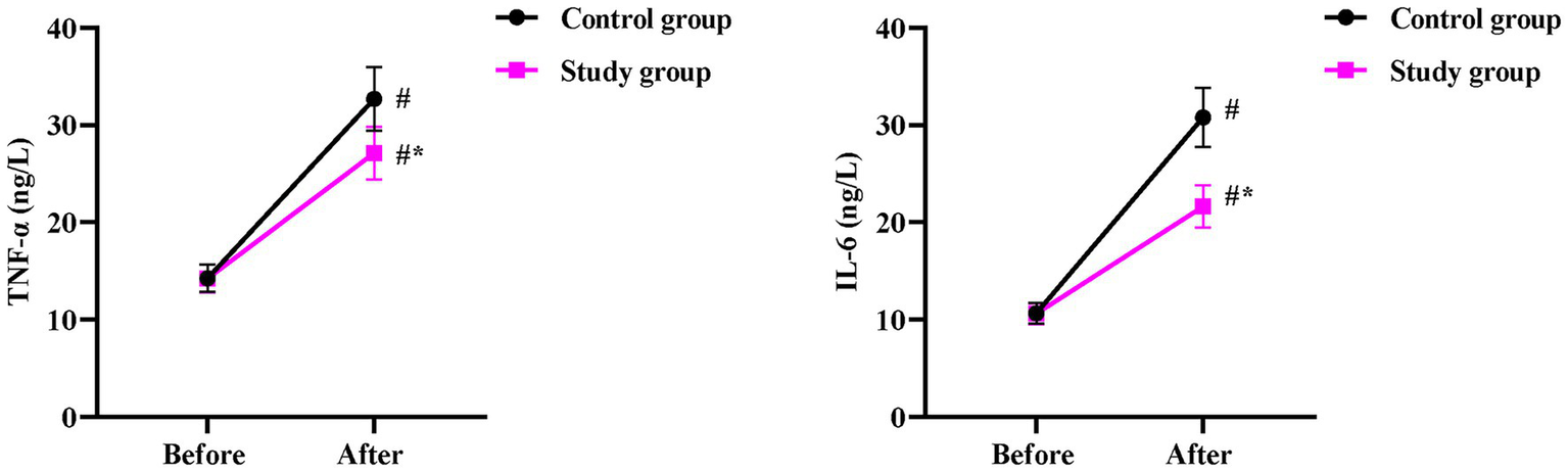 Before surgery, no significant differences were observed in serum TNF-α and IL-6 levels between the two groups (p > 0.05). One day after surgery, both groups showed a marked rise in TNF-α (p < 0.05), but the SG exhibited a significantly smaller increase (27.12 ± 2.71 ng/L) than the CG (32.68 ± 3.26 ng/L, p < 0.05, Figure 4). Similarly, one day after surgery, IL-6 concentrations increased significantly in both groups (p < 0.05), but the elevation was markedly attenuated in the SG (21.62 ± 2.16 ng/L) compared to the CG (30.78 ± 3.08 ng/L, p < 0.05, Figure 4).