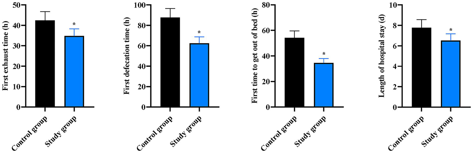Compared to the CG, the SG had significantly shorter times for first flatus (42.45 ± 4.26 h vs. 34.82 ± 3.48 h), first defecation (87.65 ± 8.78 h vs. 62.43 ± 6.25 h), first ambulation (54.23 ± 5.42 h vs. 34.52 ± 3.45 h), and length of hospital stay (7.78 ± 0.78 day vs. 6.52 ± 0.65 day) (p < 0.05, Figure 5).