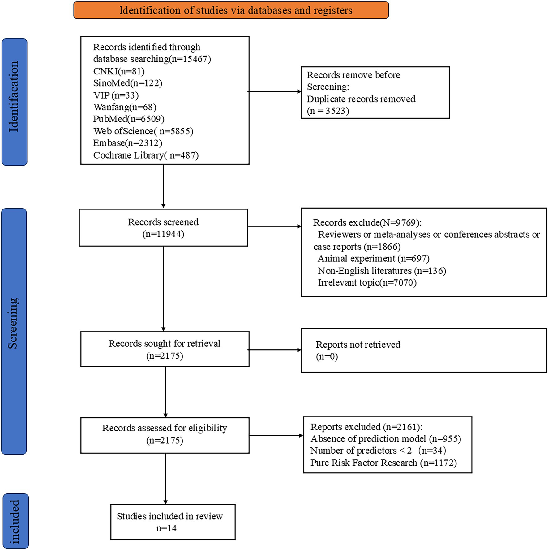 Flowchart illustrating the identification of studies via databases and registers. Initially, 15,467 records were identified. After removing 3,523 duplicates, 11,944 records were screened. Of these, 9,769 were excluded for reasons including irrelevant topics and non-English literature. Then, 2,175 records were assessed for eligibility, with 2,161 excluded due to lack of a prediction model or other criteria. Fourteen studies were finally included in the review. The process is divided into stages: Identification, Screening, and Inclusion.