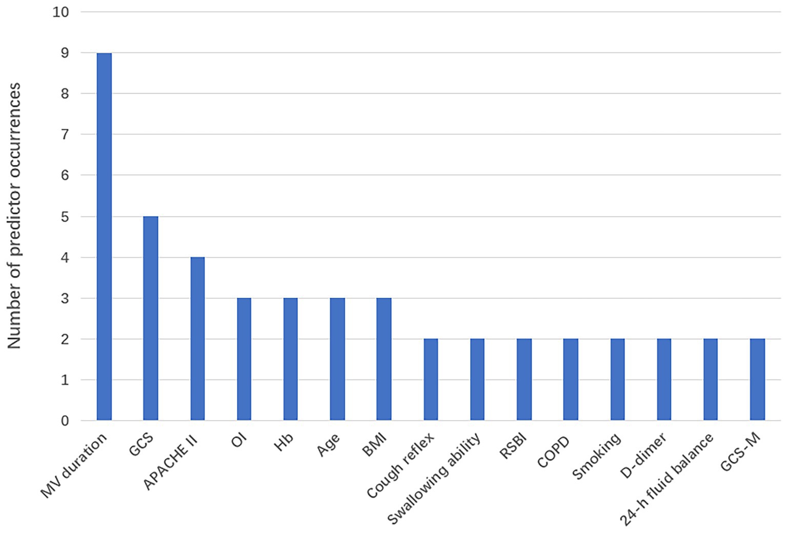 Bar chart showing the number of predictor occurrences for various factors. MV duration appears most frequently with nine occurrences, followed by GCS with five, APACHE II with four, and OI, Hb, Age, BMI, and cough reflex all with three. Swallowing ability, RSBI, COPD, smoking, D-dimer, 24-hour fluid balance, and GCS-M have two occurrences each.