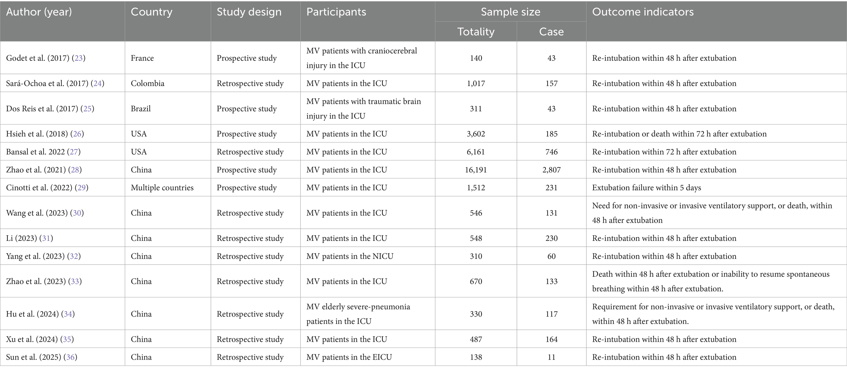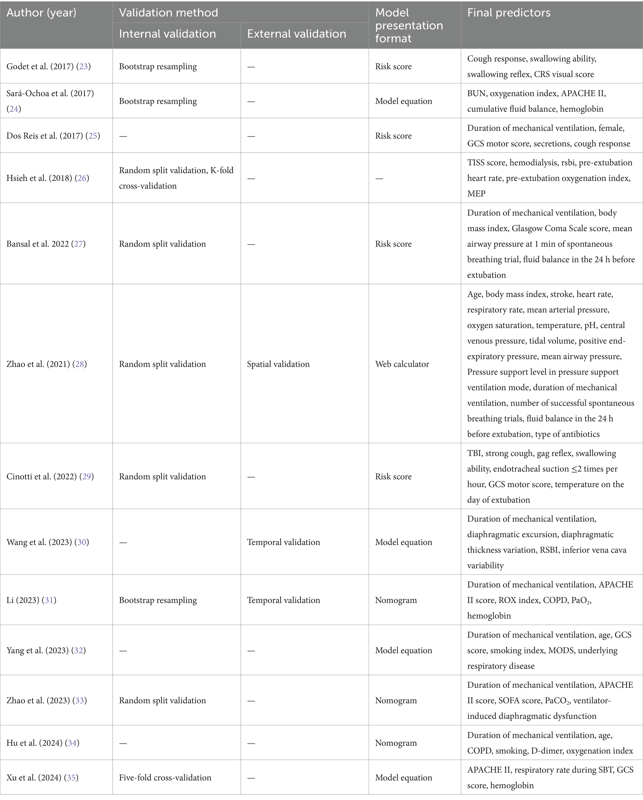 Therefore, the early identification of high-risk populations for mechanical ventilation weaning failure in the ICU, along with timely and effective interventions for their risk factors, is of significant importance in reducing the incidence of mechanical ventilation extubation failure among ICU patients and improving clinical outcomes. Risk prediction models use mathematical formulas to assess the existence of specific conditions or the future risk of certain events, effectively identifying risk factors for diseases and quantifying the magnitude of risk associated with each factor (20). Multiple countries have developed various risk prediction models for extubation failure in ICU patients undergoing mechanical ventilation. However, these different models’ predictive capabilities and clinical applicability remain unclear. Furthermore, no studies have been found that systematically evaluate these models. Therefore, this study aims to systematically evaluate the risk prediction models for extubation failure in patients undergoing mechanical ventilation in the ICU, with the intention of providing a basis for clinical medical staff to select or develop appropriate risk prediction models for extubation failure in ICU mechanical ventilation patients.