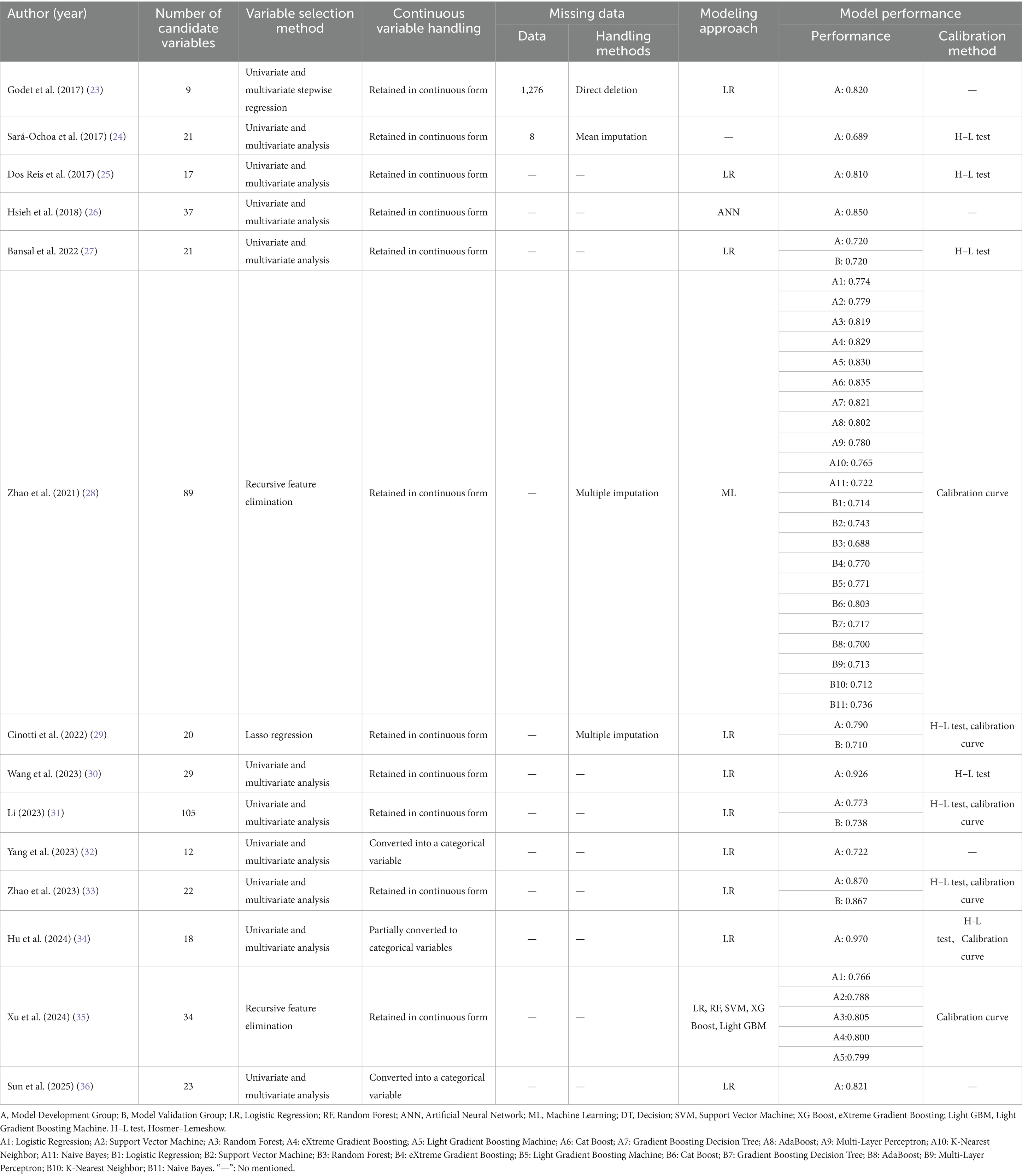 A total of 28 predictive models for the offline failure risk were reported in the studies included. The number of candidate predictive variables in each study ranged from 9 to 105. Regarding variable selection, 11 studies (2327, 3034, 36) employed univariate and multivariate analyses, 2 studies (28, 35) utilized recursive feature elimination, and 1 study (29) applied Lasso regression for variable selection. In the handling of continuous variables, 3 studies (32, 34, 36) converted continuous variables into categorical variables, while the remaining eleven studies (2331, 33, 35) maintained the continuity of the continuous variables. In the area of missing data handling, 10 studies (2527, 3036) did not report the missing data and the methods used for handling it. 2 studies (28, 29) only reported the use of multiple imputation to supplement the missing data. However, it did not specify the exact number of missing data points. 1 study (23) directly deleted the missing data, while only 1 study (24) reported the missing data and the method of mean imputation employed. Regarding model establishment methods, 10 studies (23, 25, 27, 2934, 36) utilized only Logistic Regression for modeling, while 1 study (26) employed Neural Networks for modeling. Another study (28) applied Machine Learning methods for modeling. Additionally, one study (35) utilized five methods: LR, RF, SVM, XG Boost, and Light GBM for modeling. 7 studies (23, 24, 26, 27, 29, 33, 35) conducted only internal validation, 2 studies (30, 36) performed only external validation, and 2 studies (28, 31) employed a combination of internal and external validation methods for evaluation. The remaining 3 studies (25, 32, 34) did not conduct either internal or external validation. 4 studies (23, 26, 32, 36) did not report the model calibration methods, while 10 studies (24, 25, 2731, 3335) provided calibration information, typically in the form of the Hosmer-Lemeshow test. See Tables 24.