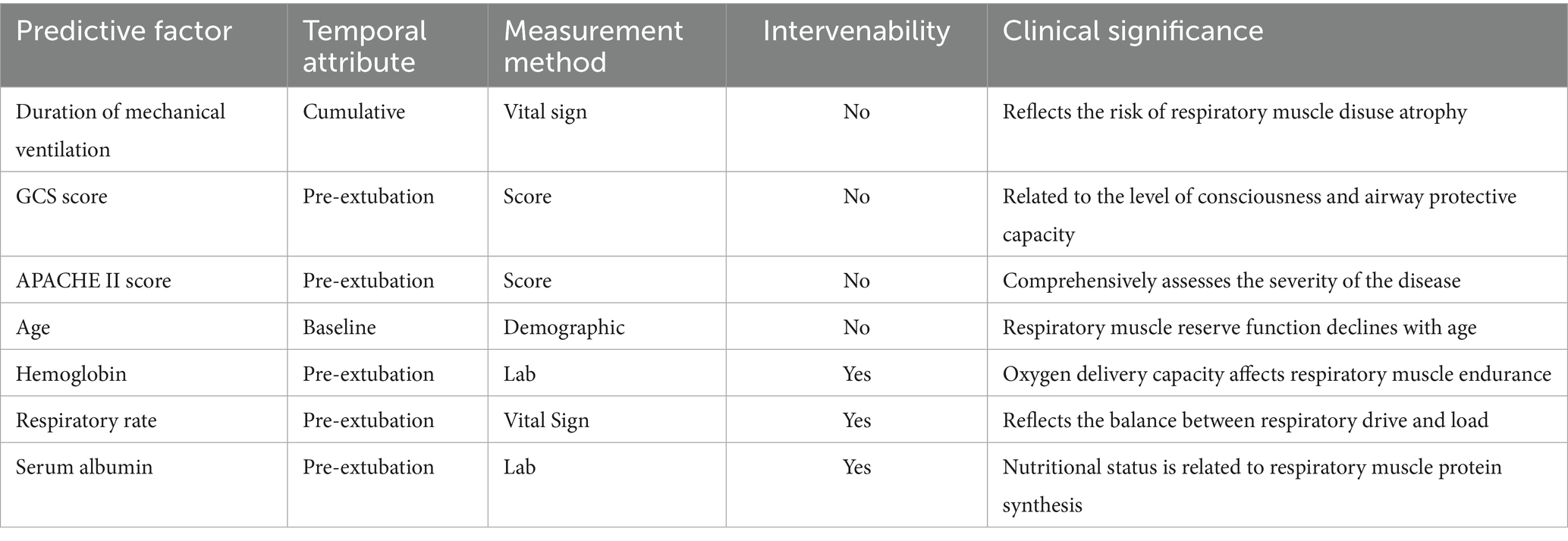Extubation, the gradual withdrawal of mechanical ventilation support, is a critical process through which critically ill patients regain their ability to breathe spontaneously and are liberated from the ventilator (8). This phase is essential for patients transitioning out of the intensive care unit. Extubation failure is the patient’s inability to sustain spontaneous breathing following extubation from the ventilator. This condition necessitates reconnection to the ventilator or occurs when spontaneous breathing lasts less than 48 h without ventilator support, requiring interventions such as non-invasive ventilation, high-flow oxygen therapy, re-intubation, terminal extubation, or tracheostomy (9). The offline process consists of three steps: offline screening, procedures, and extubation (10). The expert group of the Critical Care Medicine Branch of the Chinese Medical Association emphasizes in the “Clinical Application Guidelines for Mechanical Ventilation” that when the causes of respiratory failure in ICU patients are effectively controlled or improved, we should conduct weaning therapy as early as possible to achieve optimal therapeutic effects and prognosis (11). Determining the optimal timing for withdrawing mechanical ventilation is crucial in treatment. An appropriate extubation moment prevents unnecessary medical resource consumption and helps alleviate the financial burden on patients’ families. Related research reports that 5–30% of ICU patients experience weaning failure (12). Inappropriately delaying weaning from mechanical ventilation may increase the risk of complications such as pneumonia or ventilator-associated lung injury in patients on mechanical ventilation (13). This risk leads to increased medical costs and prolonged hospital stays for patients and may significantly elevate the overall mortality risk (14). Although successful extubation is an important goal in ICU treatment, an overly aggressive weaning process may lead to inadequate oxygen supply, respiratory muscle fatigue, and incomplete recovery of airway protective functions, which may increase the risk of extubation failure (15). It is noteworthy that extubation failure is not the result of a single pathological process, but rather the consequence of the combined effects of abnormalities across multiple systems, including the respiratory system (e.g., respiratory muscle fatigue, airway secretion retention) (16), the cardiovascular system (e.g., left ventricular overload) (17), neuromuscular function (e.g., myasthenia) (18), and metabolic status (e.g., malnutrition, frailty) (19).