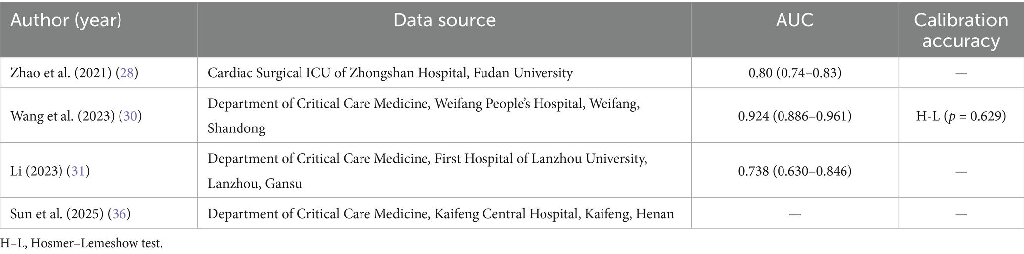① In the handling of continuous variables, Collins et al. (37) point out that when constructing risk prediction models, converting continuous variables into two or more categorical variables can increase the risk of the model. Among the studies included in this research, 3 studies (32, 34, 36) converted continuous variables into categorical variables, which may lead to a higher risk of bias in the included studies. Future studies should retain continuous predictors in their original form or model them with flexible functions such as restricted cubic splines; this preserves information, avoids arbitrary cut-point bias, and improves both discrimination and calibration. Owing to substantial heterogeneity in data sources, candidate predictor sets, and modelling methods across studies, we could not directly compare AUCs or calibration between models that kept variables continuous and those that converted them to categories. Future work should use a single dataset and an identical modelling pipeline to test both approaches and thereby quantify their true effects on discrimination and calibration. ② In the realm of missing data handling, 12 studies (2536) did not report any missing data, whereas 1 study (23) explicitly excluded subjects with missing data, which indicates inadequate handling of this issue. Such an approach may result in the loss of valuable hidden information within the excluded subjects, potentially leading to bias in the model. Missing data can significantly impact the quality of data analysis and the accuracy of models, making the preprocessing of missing data particularly important. The PROBAST guidelines suggest that missing values should not be deleted directly; instead, multiple imputation should be employed (38). Multiple imputation methods can effectively reduce the adverse effects of missing data on statistical analysis and model stability, thereby improving research accuracy and reliability (39). Future researchers should provide a comprehensive account of missing values and the methods employed to handle them during the model construction process. It is recommended that multiple imputation techniques be utilized to address these missing values effectively. ③ Selection of Predictors in this study, the predictors were primarily identified through univariate analysis to find statistically significant variables, followed by Logistic Regression analysis to incorporate these significant variables into the model. This method of screening predictors can reduce the workload but may overlook important risk factors. Therefore, it is recommended that future research utilize stepwise regression to mitigate multicollinearity issues effectively. LASSO regression, which employs the least absolute shrinkage and selection operator, can perform parameter estimation and variable selection simultaneously. ④ In terms of model validation, only 2 studies (28, 31) conducted internal and external validation, while 7 studies (23, 24, 26, 27, 29, 33, 35) performed only internal validation (Bootstrap resampling and random grouping validation) 0.2 studies (30, 36) conducted only external validation, and three studies (25, 32, 34) did not perform either internal or external validation. Therefore, future researchers may choose high-quality predictive models for external validation for the risk of extubation failure in ICU patients on mechanical ventilation based on the results of this study.