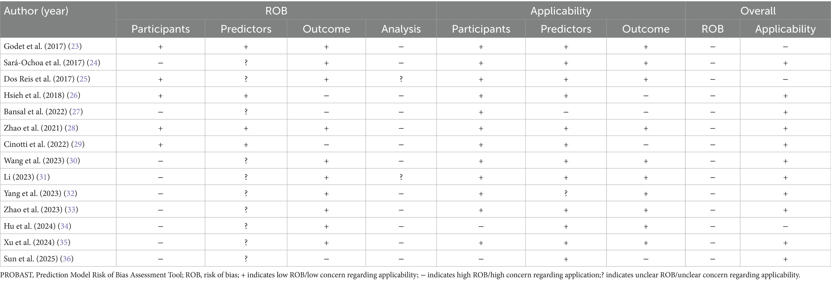 PROBAST comprises four domains: study population, predictors, outcomes, and analysis. Each question can be answered as “Yes,” “Probably Yes,” “Probably No,” “No,” or “No Information.” If any domain is rated as “No” or “Probably No,” that domain is considered high risk; only when all questions are answered as “Yes” or “Probably Yes” is the domain considered low risk. If all four domains are assessed as low risk, the overall risk of bias (ROB) is rated as “Low”; if one or more domains are rated as uncertain risk while the remaining domains are low risk, the overall risk is classified as “Unclear.” The applicability assessment is similar to the bias risk assessment but uses only the first three domains to determine the applicability of the prediction model. The first two researchers (ZX and CXJ) conducted the assessments independently, with the final judgment made by a third reviewer (QXY).