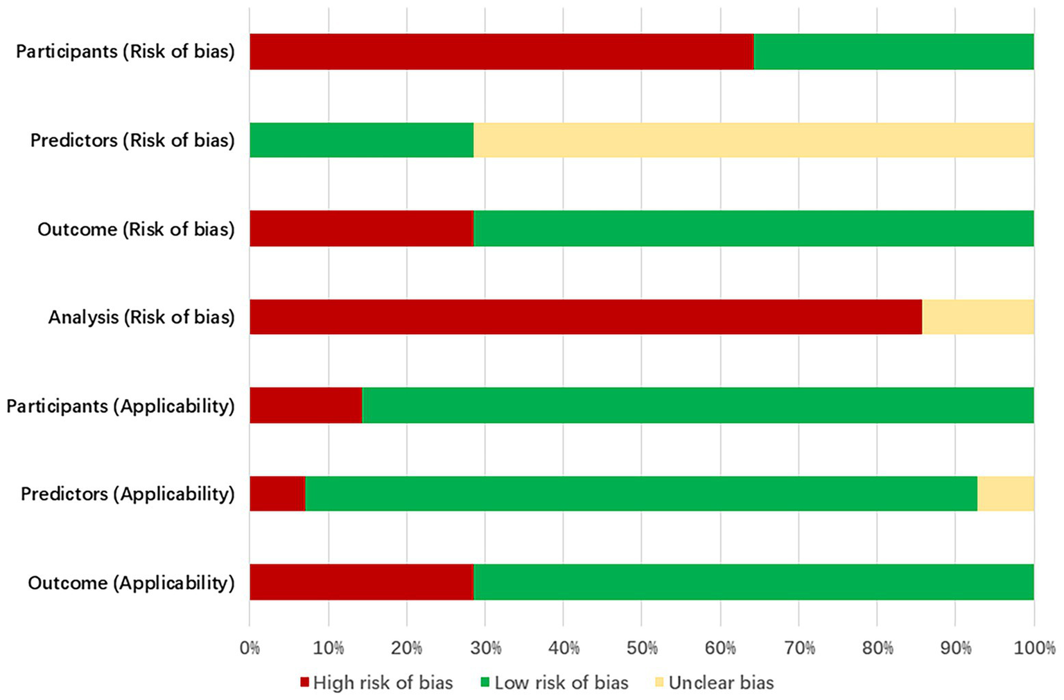 The applicability assessment encompasses three domains: the study subjects, the predictive factors, and the outcomes. The judgment process is similar to bias risk, where the overall applicability of the predictive model is rated as ‘low’, ‘high’, or ‘unclear’. The overall rating is deemed ‘low risk’ only when all domains are assessed as ‘low risk’. If one or more domains are rated as ‘high risk’, the applicability is classified as ‘high risk’. If a particular domain is rated as ‘unclear’, but all other domains are rated as ‘low risk’, the applicability is considered ‘unclear’.