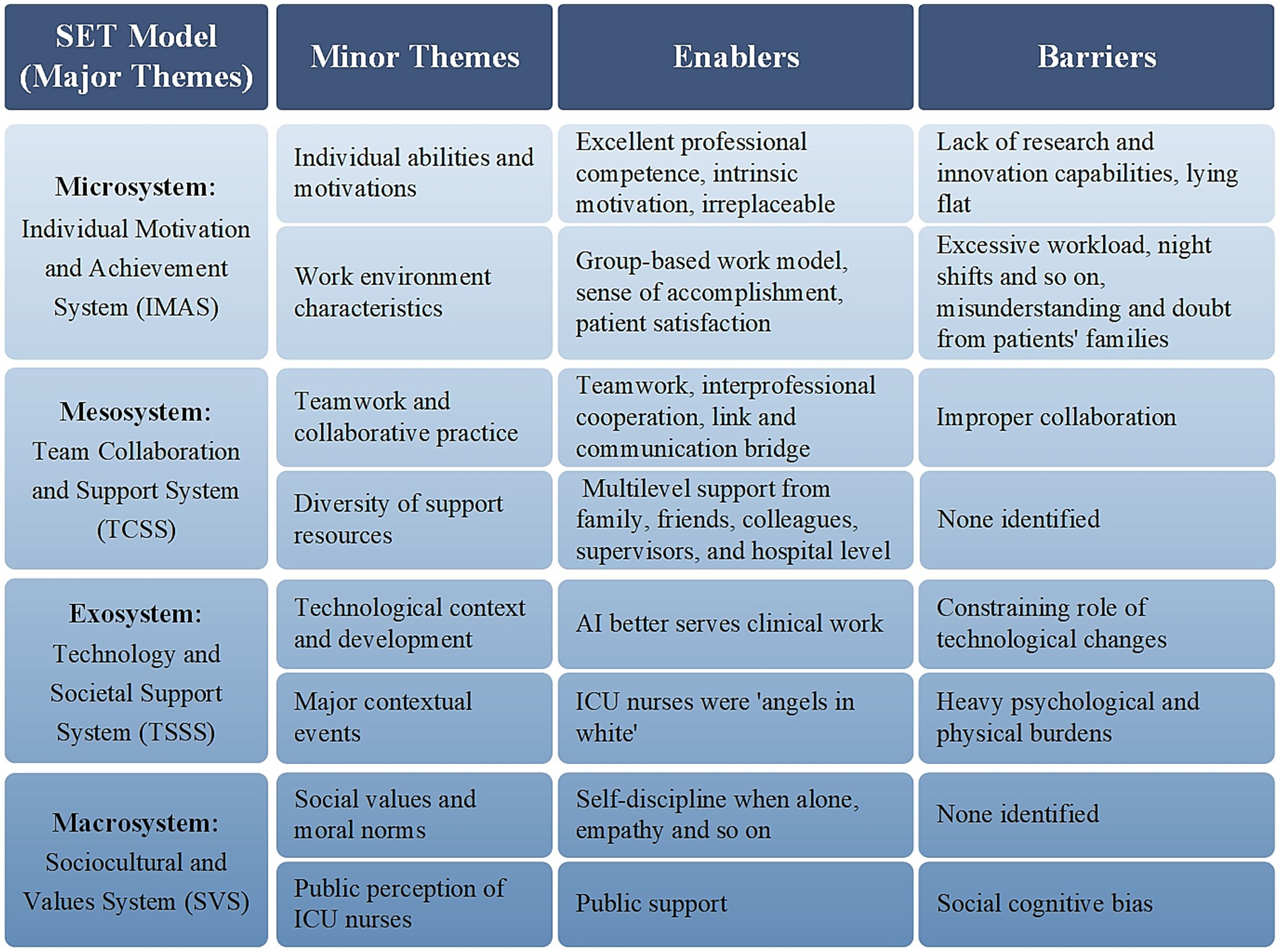 Results: We developed four themes to explain the qualitative data: Individual Motivation and Achievement System (IMAS), Team Collaboration and Support System (TCSS), Technology and Societal Support System (TSSS), Sociocultural and Values System (SVS). IMAS highlighted intrinsic motivation, professional competence, and patient satisfaction as key enablers, while lack of research and innovation capabilities, excessive workload, frequent night shifts, and misunderstanding from patients’ families constitute major challenges. TCSS reflected the importance of effective teamwork and multilevel support, with improper collaboration identified as a barrier. TSSS emphasizes the dual role of advanced technology and public health emergencies, representing both opportunities and challenges. SVS reflects the beneficial effect of positive social perceptions and cultural values, contrasted with social cognitive biases as obstacles.