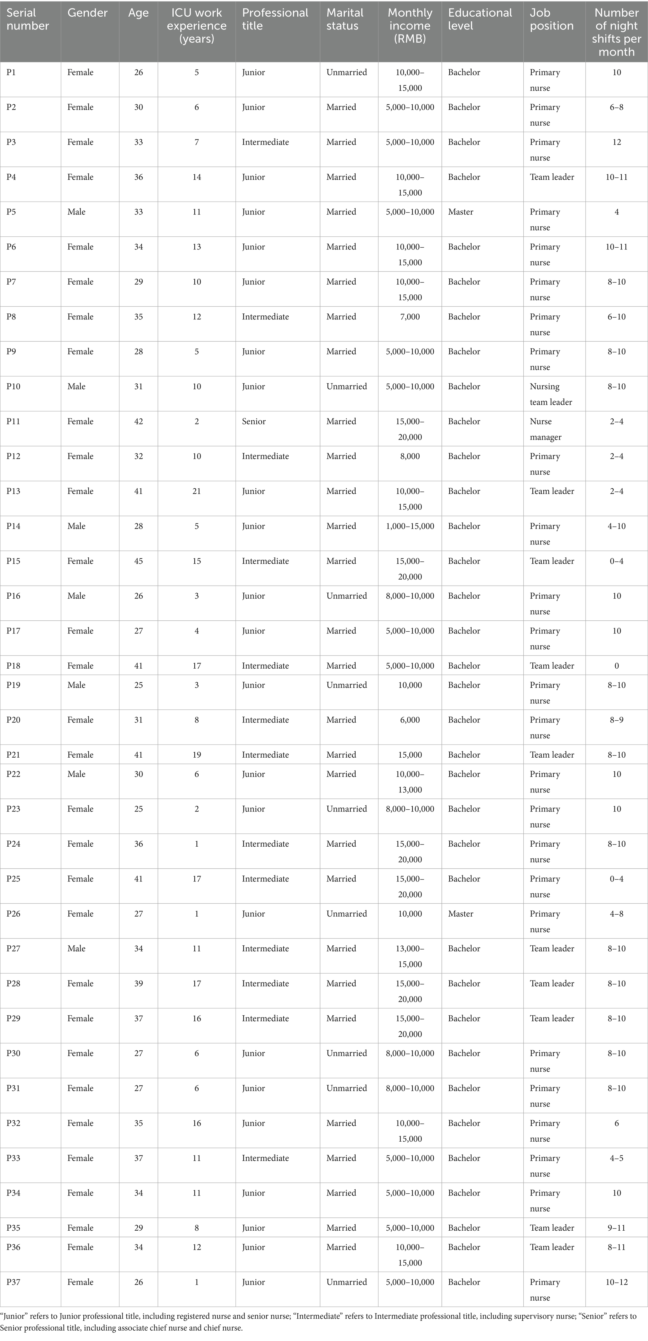 Thirty-seven participants were included in the final analysis, comprising 30 females (81%). The mean age of participants was 32.76 years (SD = 5.54), ranging from 25 to 45 years. Their work experience in ICU ranged from 1 to 21 years, with a mean of 9.24 years (SD = 5.58). Thirteen participants (35%) held intermediate professional titles, 57% hold junior titles despite one-third accruing ≥10 years’ ICU experience, and only 8% have progressed to senior/managerial rank, revealing a compressed career ladder. Three-quarters earn ≤15,000 RMB monthly, while married nurses predominate (76%) yet single staff shoulder the heaviest night-shift load (8 ~ 12/month). Educational attainment is high (92% bachelor’s, 8% master’s), but advanced degrees remain under-leveraged in junior roles. The interviews lasted approximately 30–40 min. The general Information of the participants are detailed in Table 1.