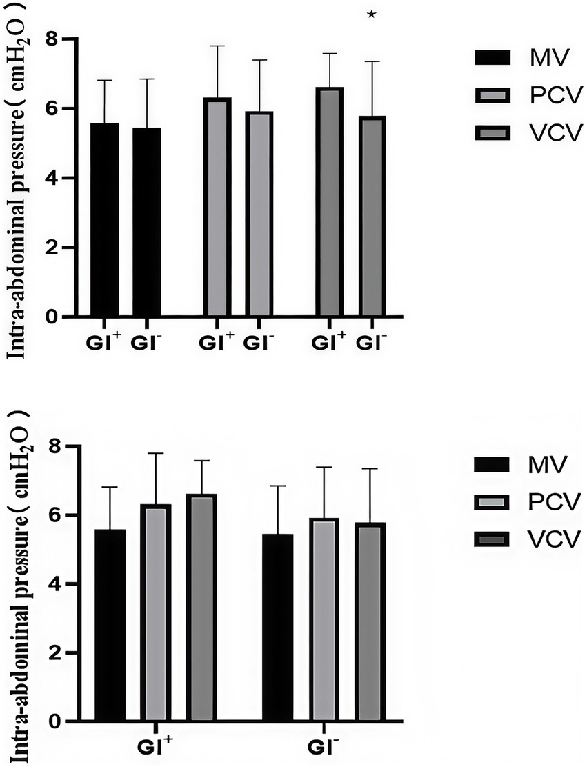 A post-hoc power analysis was performed to verify the adequacy of power for the primary outcome (T0-T1 IAP change), as the initial sample size calculation was based on T2 IAP data due to limited pilot data on T0-T1 changes at the study design stage. Using G*Power 3.1.9.7 software, we inputted the observed mean IAP changes (MV group: 1.79 ± 2.05 cmH₂O; PCV group: 1.63 ± 2.11 cmH2O; VCV group: 1.91 ± 2.23 cmH2O) and standard deviations (MV: 2.39, PCV: 2.45, VCV: 2.57) from the study. With a sample size of 152 patients, α = 0.05, and a two-tailed test, the post-hoc power was calculated as 82.3%, which exceeds the conventional threshold of 80%, indicating that the study was adequately powered for the primary outcome.