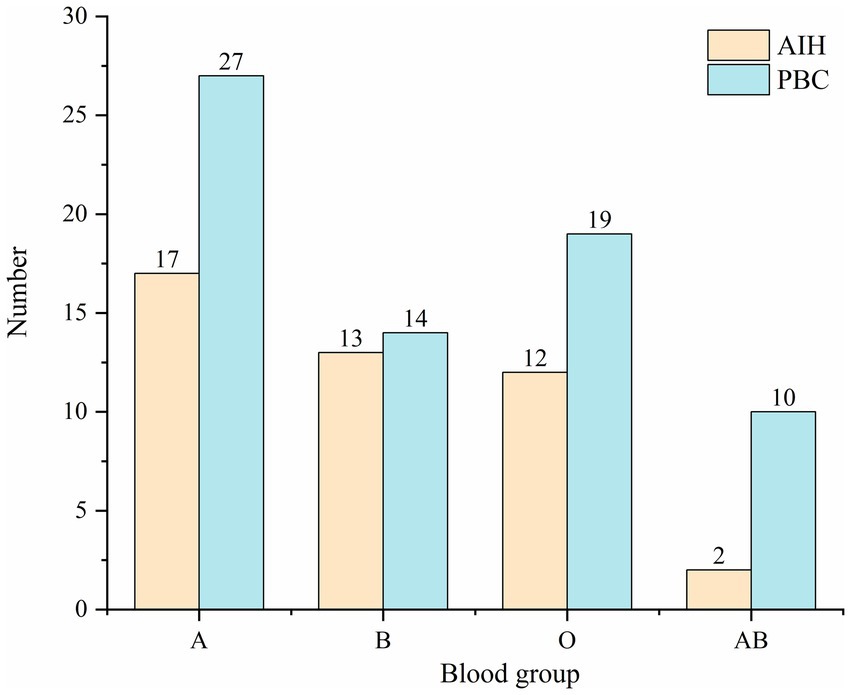 Results: Of 114 patients, 44 (38.60%) were diagnosed with autoimmune hepatitis (AIH), and 70 (61.40%) were diagnosed with primary biliary cholangitis (PBC). A significant difference was found between ABO blood groups and AILD patients. Compared with the controls, blood type A was more prevalent in the AILD group (OR, 1.784; p < 0.05), whereas blood type B was less (OR, 0.638; p < 0.05). Moreover, patients with PBC had a higher percentage of type A (OR, 2.656; p < 0.01) and a lower percentage of type B (OR, 0.514; p < 0.05). No significant difference was found in blood type O and AB (p > 0.05).