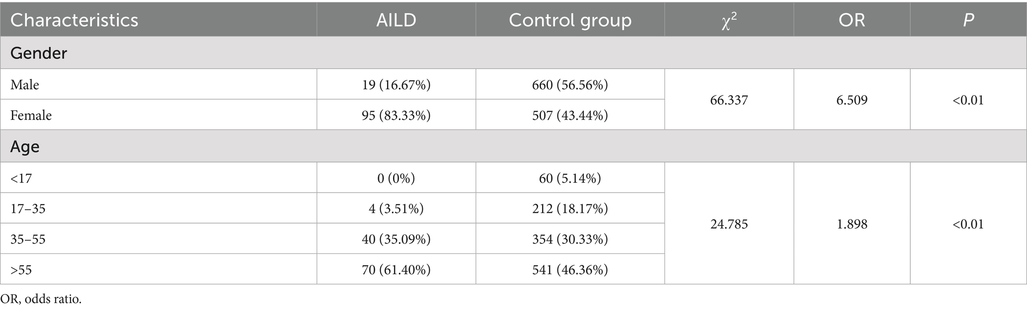 A total of 114 patients with AILD, and 1,167 healthy people were enrolled in this study. Among them, there were 19 (16.67%) males and 95 (83.33%) females in patients with AILD and 660 (56.56%) males and 507 (43.44%) females in the control group. The age distribution of patients ranged from 18 to 84 years old, and that of healthy controls in the range of 1 to 96 years old. Significant differences were found in gender and age between patients with AILD and healthy controls (p < 0.01) (Table 1).