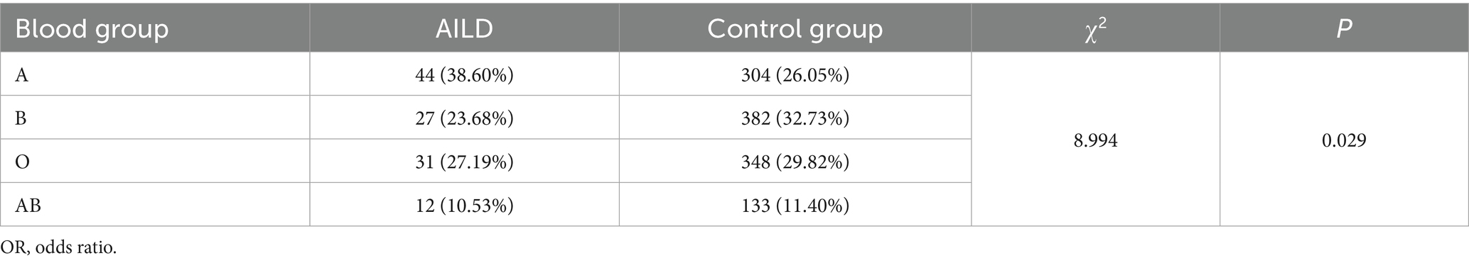 The distribution of ABO blood groups in the control group and patients with AILD was shown in Table 2. The results indicated that the distribution of ABO in the case group was A (38.60%), B (23.68%), O (27.19%) and AB (10.53%). And the control group was A (26.05%), B (32.73%), O (29.82%), and AB (11.40%). It was observed that there was a significant difference in the distribution of ABO blood types (2 = 8.994, p < 0.05).
