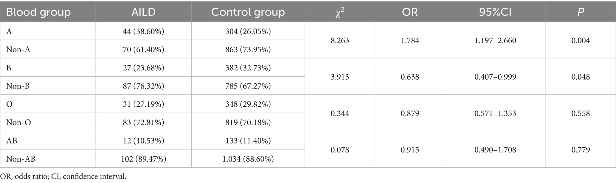 Methods: A retrospective cohort study was conducted on 114 AILD patients and 1,167 healthy individuals from January 2019 to February 2024. Blood type was determined with the gel microcolumn assay. Chi-square test and logistic regression were performed to investigate the association between blood type and the risk of AILD.