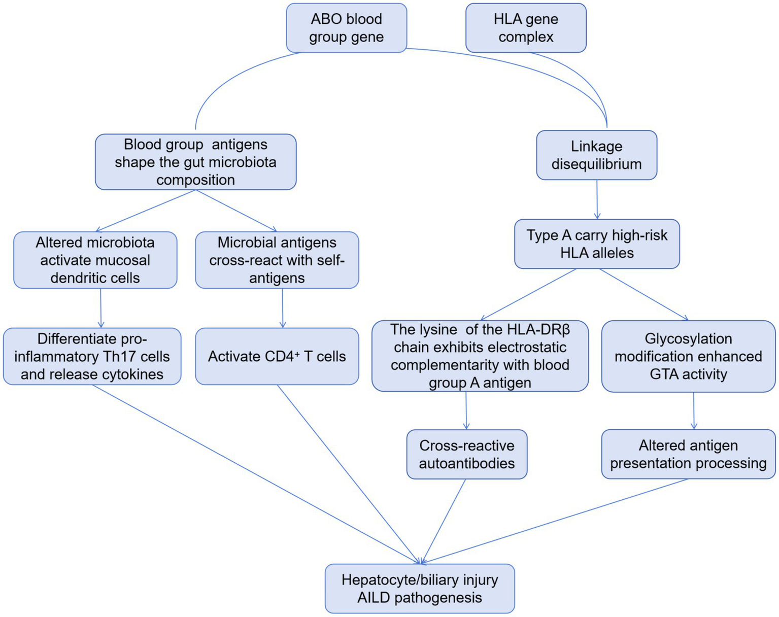 It has been confirmed that human leukocyte antigen (HLA) class I and II-haplotypes are strongly related to the pathogenesis and development of AILD (15). Although the ABO blood group gene (9q34.2) and the HLA complex (6p21.3) are located on different chromosomal regions, they both belong to immune-related gene clusters and have developed significant linkage disequilibrium (LD) during evolution due to genetic drift or selective pressure. The association between type A blood and AILD discovered in this study may essentially be that individuals with type A blood “carry” multiple high-risk HLA alleles for AILD through LD. Studies have shown that there is a significant linkage disequilibrium between ABO blood type (especially type A) and HLA-DRB1 and DQB1 alleles (for example, people with type A blood are more likely to carry HLA-DRB1*03:01 and DRB1*04:01 alleles) (16). These HLA alleles have been confirmed to be associated with AILD susceptibility (for example, HLA-DRB1*03:01 is associated with AIH and PBC; DRB1*04:01 is associated with PBC) (17). Therefore, people with blood type A carry high-risk HLA alleles due to LD, which constitutes an important basis for genetic susceptibility to AILD. Moreover, the lysine at position 71 of the HLA-DRβ chain (the characteristic residue of DRB1*03:01) exhibits electrostatic complementarity with the terminal N-acetylgalactosamine of blood group A antigen (18, 19). This structural similarity may lead to aberrant activation of B cells targeting blood group A antigens, subsequently inducing the production of cross-reactive autoantibodies that attack hepatocytes (20). Meanwhile, the ABO gene encodes glycosyltransferases that modify N- or O-linked glycans on cell surface glycoproteins (21). Due to the activity of α-1, 3-N-acetylgalactosaminotransferase (GTA) in individuals with type A blood, specific glycosides (such as A antigen) may be introduced into the glycosylation modification of HLA molecules, affecting their binding efficiency with antigen processing associated transporters (TAP), or altering the loading preference of antigen peptides, making it easier for self-antigen peptides to be presented. Besides, ABO blood group antigens are widely expressed in intestinal mucosal epithelium and secretions, and can indirectly regulate immune homeostasis by shaping the colonization environment of the microbiota (22, 23). The A antigen on the intestinal mucosa surface of individuals with type A blood can act as an adhesion receptor for symbiotic bacteria (such as Bacteroides), promoting the enrichment of specific bacterial communities (such as sulfate-reducing bacteria) (24). On the one hand, these microbiota can induce the differentiation of Th17 cells by activating intestinal mucosal dendritic cells (DCs), promote the secretion of inflammatory factors (IL-17A, IL-22), and enhance liver immune infiltration (25). On the other hand, microbiota antigens (such as lipopolysaccharides and peptidoglycan) may have cross-reactions (molecular simulation) with autoantigens, activating CD4+ T cells targeting liver autoantigens through the cross-presentation of HLA class II molecules (26). Collectively, the association between blood type and elevated risk for AILD can be conceptualized through several interconnected immunological pathways, encompassing HLA-mediated genetic predisposition, cross-reactive autoantibody induction, and microbe-dependent immunomodulation, which are schematically summarized in Figure 2.