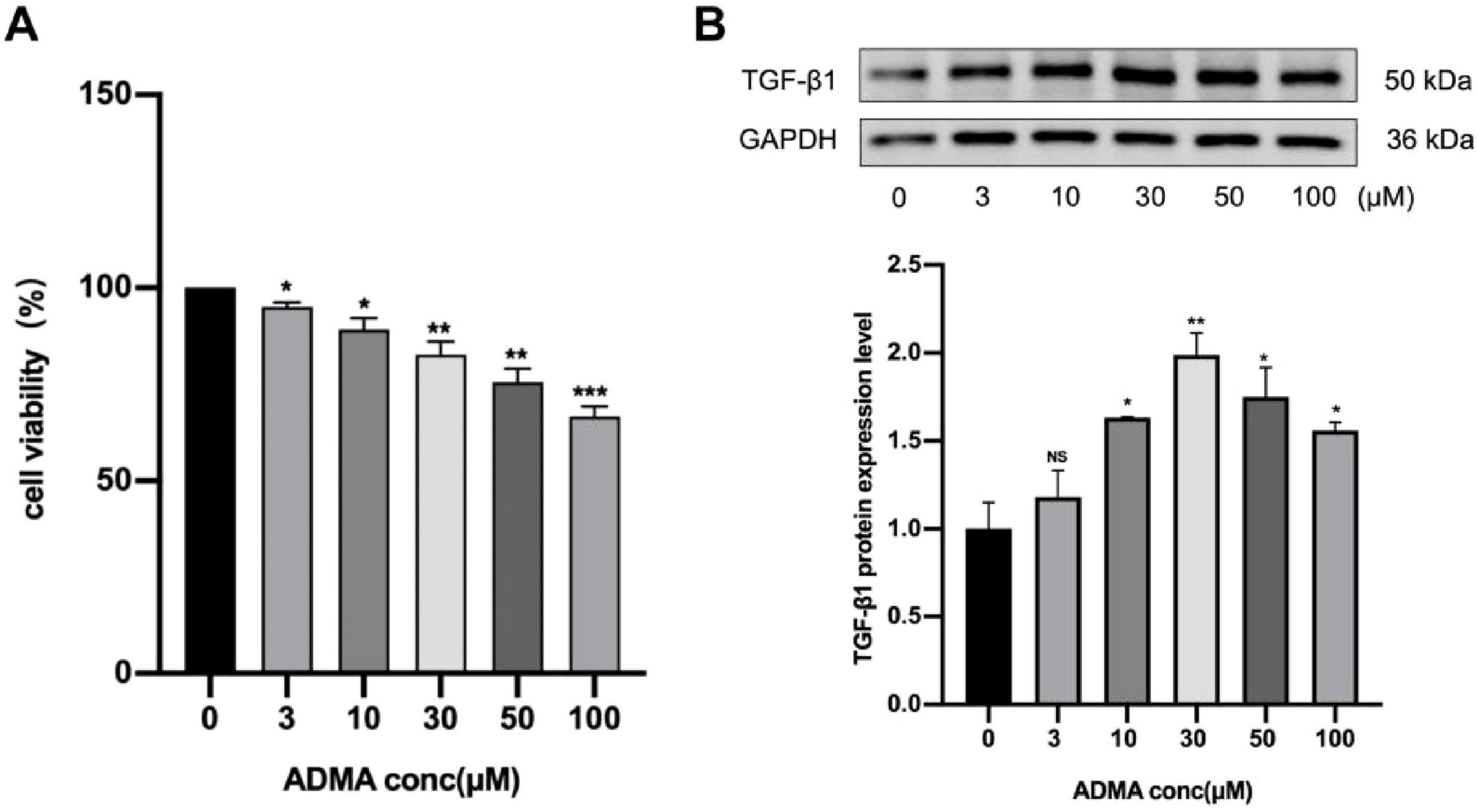 Figure 1. Asymmetric dimethylarginine (ADMA) promotes atrial remodeling in HL-1 cells. (A) The viability of HL-1 cells was evaluated under varying ADMA concentrations (0, 3, 10, 30, 50, 100 μM). (B) Representative images and a comparison of transforming growth factor-β1 (TGF-β1) protein levels from western blots in six groups. n = 3 per group. Data are presented as mean ± SD. Statistical significance was determined using One-way ANOVA, and Tukey’s post-hoc test. *P < 0.05, **P < 0.01 vs. the normol control group.