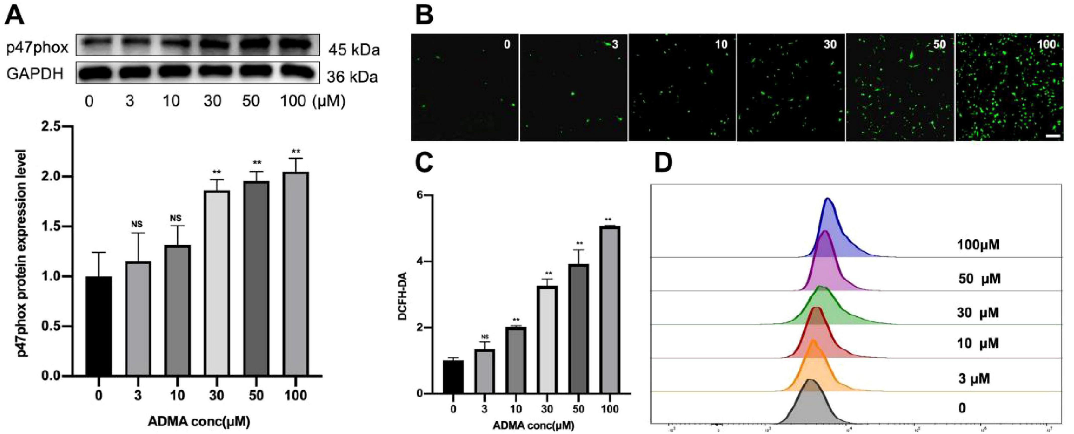 Figure 2. Asymmetric dimethylarginine (ADMA) promotes oxidative stress in HL-1 cells. (A) Representative images and a comparison of p47phox protein levels from western blots in six groups. n = 5 per group. (B,C) The representative images and quantification of ROS in six groups. n = 5 per group. scale bar = 50 μm. (D) Flow cytometry was utilized to detect ROS levels in HL-1 cells treated with different concentrations of ADMA. Data are presented as mean ± SD. Statistical significance was determined using One-way ANOVA, and Tukey’s post-hoc test. *P < 0.05, **P < 0.01 vs. the normol control group.