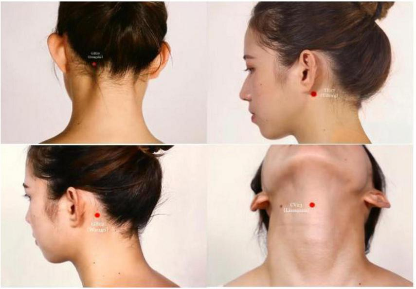 | GB12 (Wangu) | On the neck, at the posterior and inferior depression of the mastoid process behind the ear. |