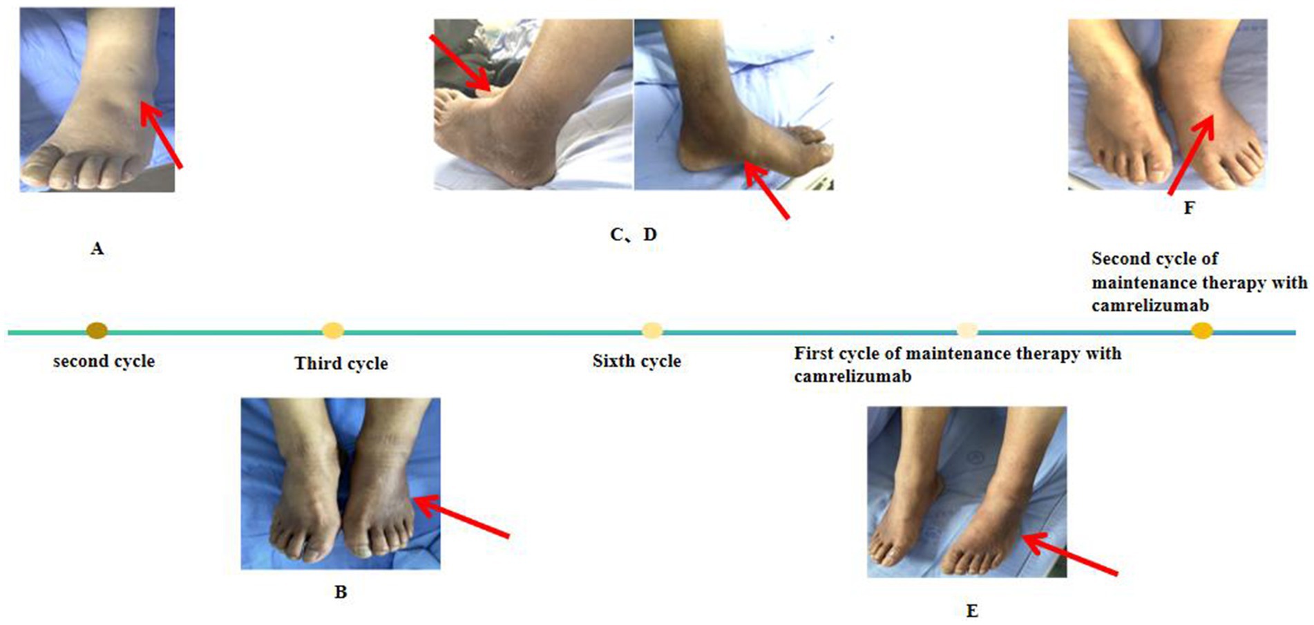 The patient remained capable of self-care and minor physical activities, such as walking and simple household tasks. He experienced mild lower limb pain that did not affect sleep. Therefore he showed Performance Status (PS) and Numeric Rating Scale (NRS) scores of 1 and 2, respectively. Vital signs were stable, and he was conscious and responsive. Significant pigmentation was observed on both lower limbs, particularly on the dorsum of the left foot and ankle (Figures 1A,B). Laboratory investigations, including complete blood count and liver and renal function tests, were normal. Chest computed tomography (CT) findings indicated treatment efficacy evaluated as Partial Response (PR). With no apparent contraindications to chemotherapy, the patient underwent a sixth cycle of camrelizumab (200 mg, ivgtt d0) and pemetrexed (600 mg, ivgtt d1) on 29 March 2024. However, he continued to experience plantar numbness, with increased pigmentation, desquamation, and pain in the left ankle (Figures 1C,D). Diclofenac sodium gel was applied topically three times daily to alleviate pain, and mecobalamin (one tablet) was administered orally three times daily to support nerve health. Subsequently, pemetrexed was discontinued, while camrelizumab was continued for two cycles as maintenance therapy. During this period, pigmentation in the lower extremities gradually decreased (Figures 1E,F).