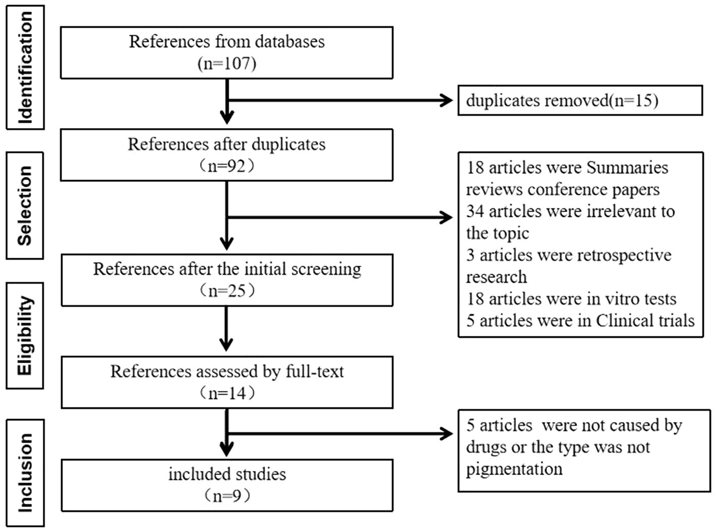 A literature search was performed following the PRISMA statement guidelines. Case reports of pemetrexed-induced pigmentation published in PubMed, EMBASE, CNKI, China Wanfang, and China VIP databases up to 31 December 2024 were reviewed. Both free-text and subject-heading searches were conducted using the terms “Pemetrexed Disodium,” “Pemetrexed,” and “Pigmentation.” A total of 107 articles were identified, including 61 from PubMed, four from EMBASE, nine from CNKI, 14 from China Wanfang, and 19 from China VIP. After excluding 98 publications such as summaries, duplicates, reviews, unrelated topics, retrospective studies, in vitro experiments, and conference papers, nine articles were finally included. A schematic of the literature screening is shown in Figure 2. The summary of published case reports on pemetrexed-induced pigmentation is presented in Table 2.