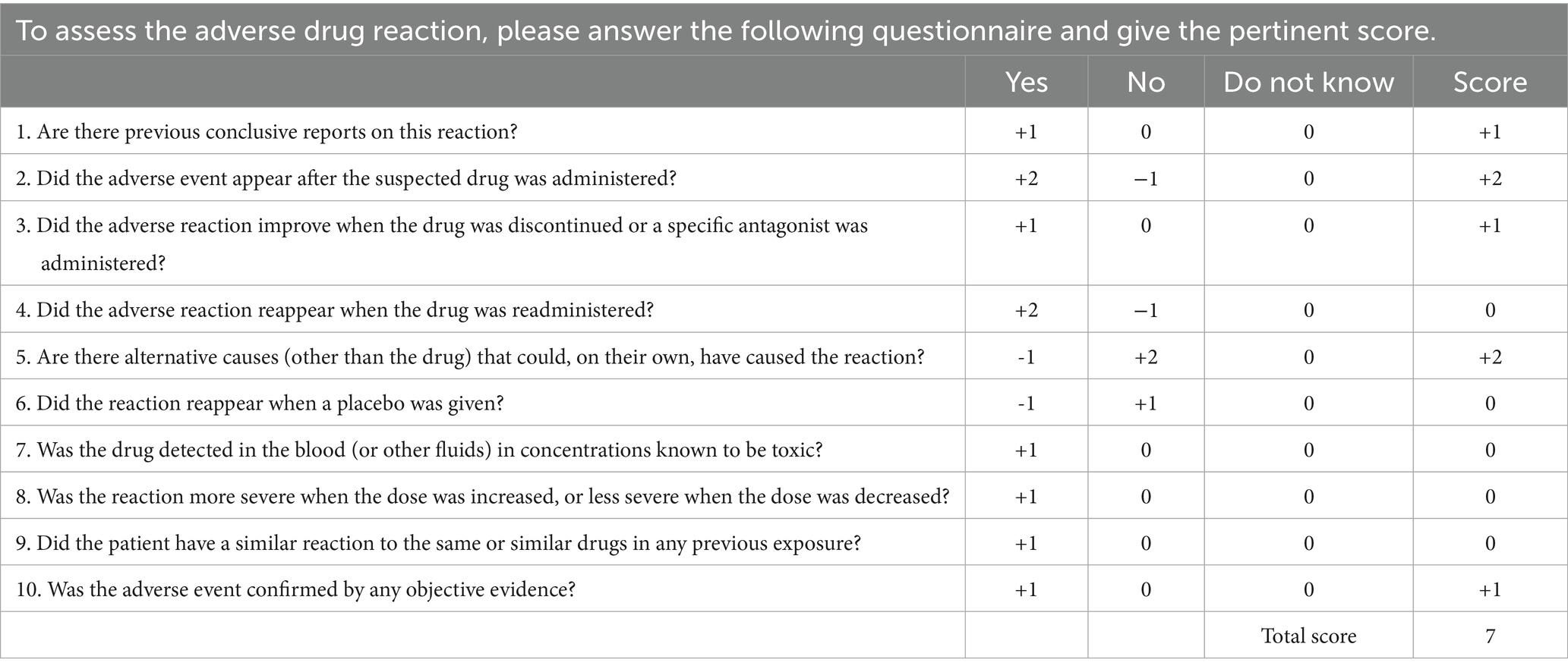 Further investigations, such as lower extremity vascular ultrasound, thyroid function, adrenocorticotropic hormone (ACTH), and antinuclear antibody tests, are useful to exclude rheumatic or immune-related diseases. Lung adenocarcinoma can also cause paraneoplastic syndromes, including pigmentation (18), which generally resolves when the underlying condition improves. In this case, however, pigmentation worsened despite clinical improvement of the malignancy. Based on this analysis, and with a final Naranjo’s scale score of 7 (a score of ≥9 indicates definite, 5–8 probable, 1–4 possible, and ≤ 0 doubtful), the patient’s pigmentation was judged as probably caused by pemetrexed. According to the Common Terminology Criteria for Adverse Events (CTCAE v5.0), pigmentation involving <10% of the body surface area is classified as grade 1. Table 1 presents Naranjo’s probability scale for assessing pemetrexed-associated pigmentation.