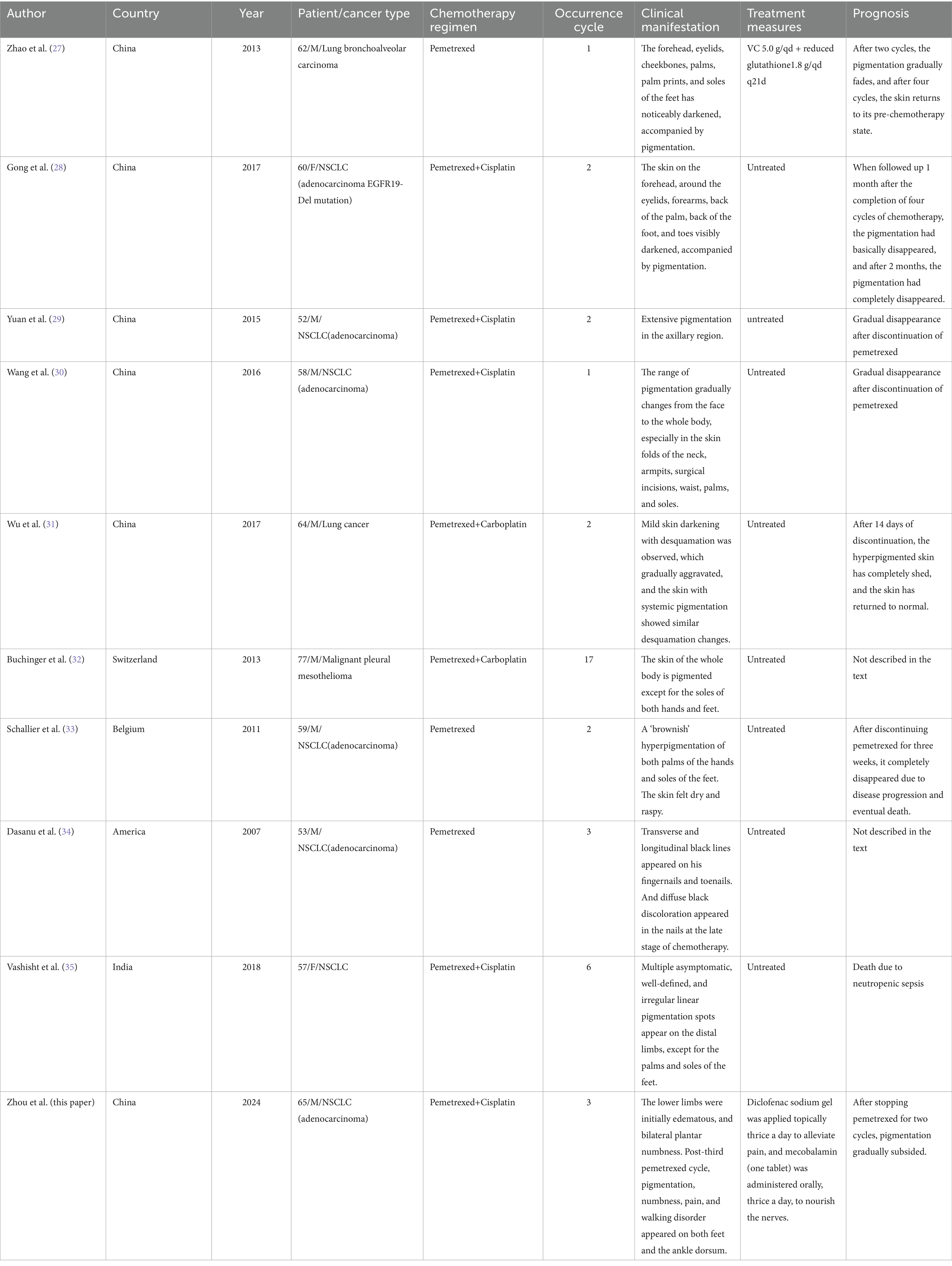 The median onset of pigmentation was during the second cycle (range: 1–17 cycles) (27–35). Most cases were asymptomatic; only two patients experienced pigmentation accompanied by pain, and none developed itching. Among the ten included patients, only two patients underwent the treatment; the rest were kept for observation, and the dose of pemetrexed was not adjusted. Three patients did not report outcomes, one died due to sepsis, and the pigmentation of the remaining six patients was reversible. Pemetrexed generally subsided after drug discontinuation, although the regression time varied among individuals. The patient in this report developed pigmentation after the third cycle, which became more pronounced with subsequent cycles. Pigmentation was primarily concentrated in the lower limbs and accompanied by numbness, pain, and walking difficulties. Diclofenac sodium gel was used to alleviate pain, and mecobalamin tablets were administered to nourish the nerves. The pigmentation gradually subsided after discontinuation of pemetrexed.