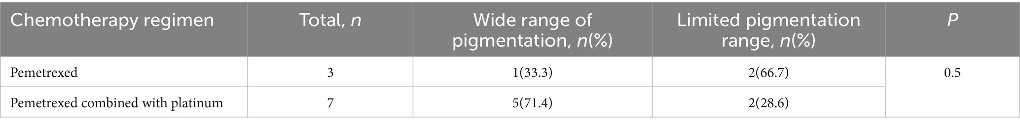 In total, 10 patients were analyzed (27–35), including six from China and one each from Switzerland, Belgium, the United States, and India. Nine patients had lung cancer, and 1 had malignant pleural mesothelioma. In terms of chemotherapy regimens, seven patients received pemetrexed combined with platinum, while three were treated with pemetrexed monotherapy. Pigmentation was observed in various body sites, including the forehead, periorbital region, face, limbs, and axillae, with nails being a particularly site. The chemotherapy regimens of ten patients suggest that pemetrexed with platinum drugs causes extensive pigmentation compared to pemetrexed alone. But after using SPSS 27.0 version, no significant differences were observed between the two as per Fisher’s exact test. The relationship between the treatment regimen containing pemetrexed and the extent of pigmentation is detailed in Table 3.