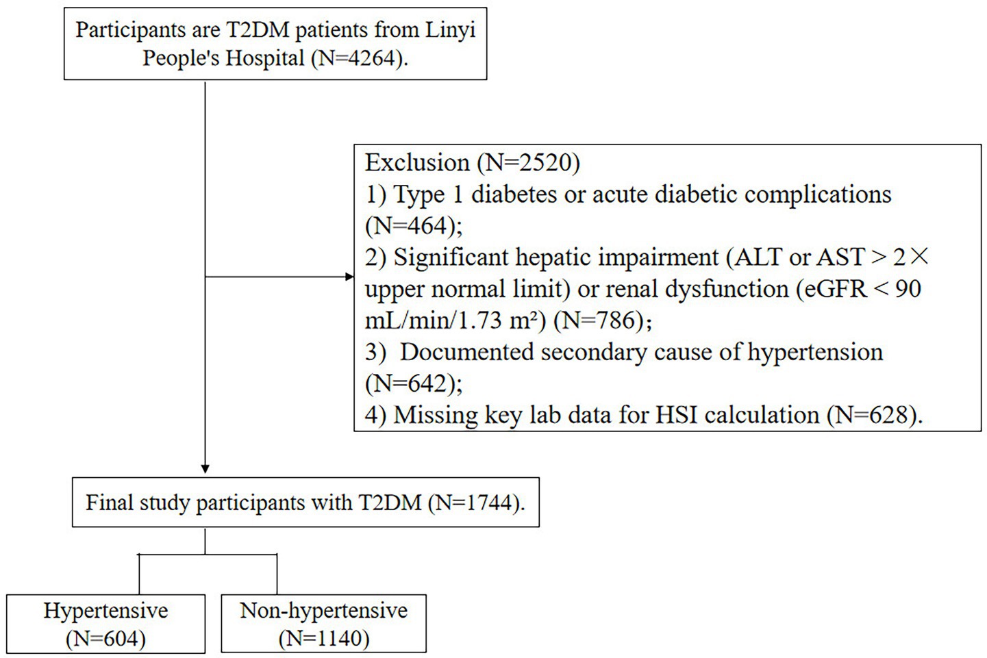 Exclusion criteria were as follows (1) type 1 diabetes or acute diabetic complications; (2) significant hepatic impairment (defined as ALT or AST levels exceeding twice the upper normal limit) or renal dysfunction (eGFR < 90 mL/min/1.73 m2); (3) any documented secondary cause of hypertension; and (4) missing key laboratory data required for the calculation of the HSI.