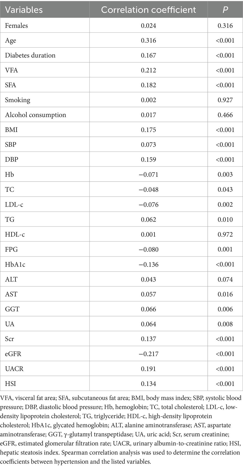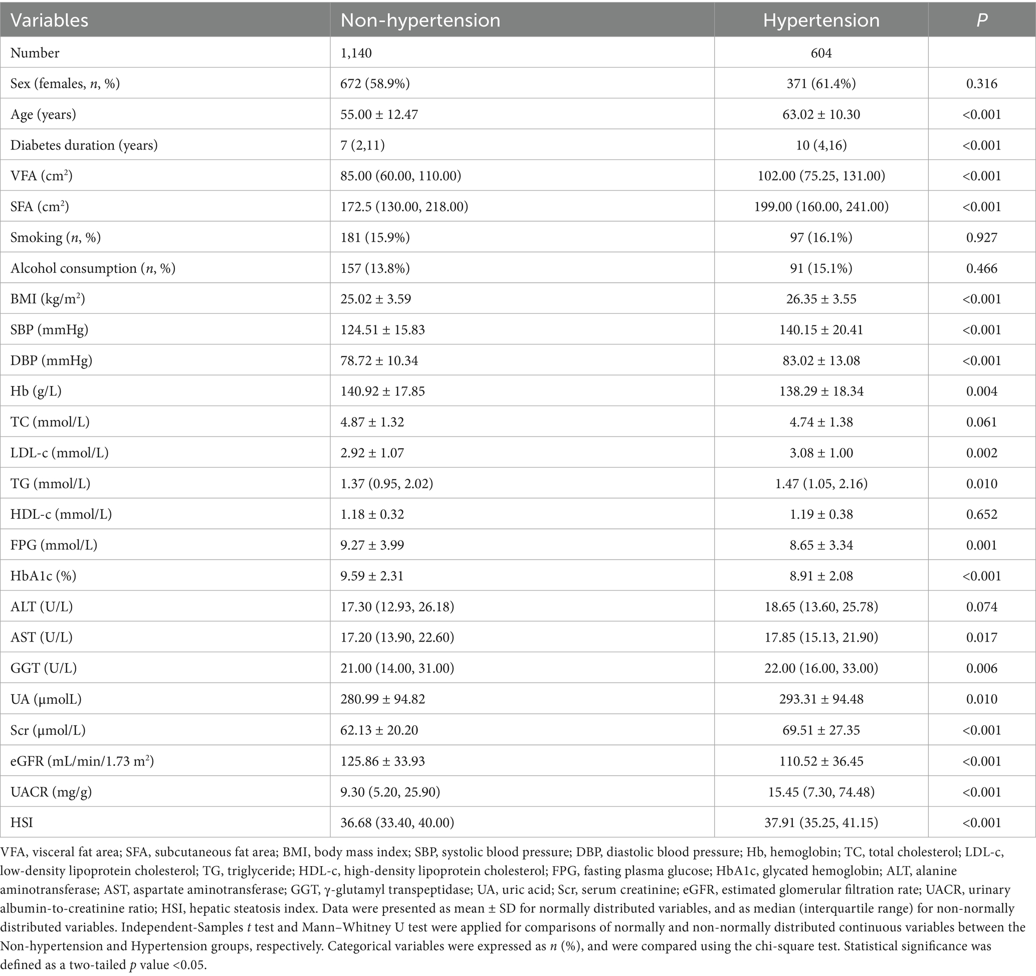 Table 1 displays the clinical and biochemical characteristics of the study population. Patients were categorized into a non-hypertensive group (n = 1,140) and a hypertensive group (n = 604). Compared with non-hypertensive patients, those with hypertension were older, had a longer diabetes duration, and exhibited higher BMI, SBP, DBP, VFA, and SFA (all p < 0.001). In contrast, FPG and HbA1c levels were significantly lower in the hypertensive group (p = 0.001 and p < 0.001, respectively). With respect to lipid profiles and liver and kidney function, hypertensive patients demonstrated higher LDL-c, AST, GGT, UA, Scr, UACR, and HSI (all p < 0.05), along with reduced eGFR (p < 0.001). No significant differences were found in sex distribution, smoking and alcohol consumption, TC, HDL-c, or ALT between the two groups (all p > 0.05).