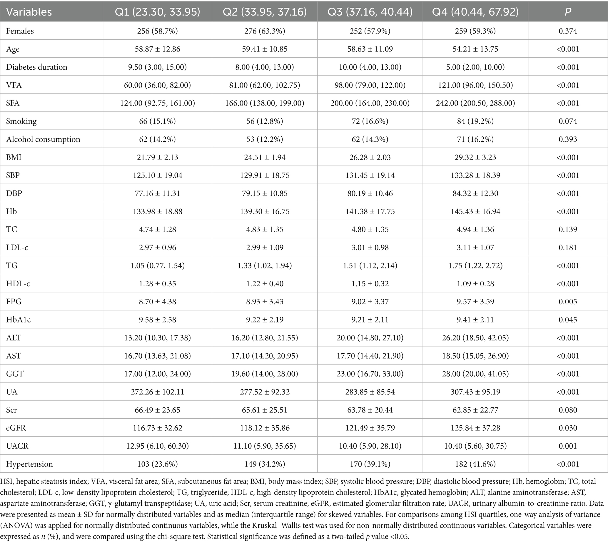 Table 2 summarizes the clinical and biochemical variables stratified by HSI quartiles. As HSI increased, patients exhibited progressively higher VFA, SFA, BMI, SBP, DBP, Hb, TG, ALT, AST, GGT, and UA, whereas HDL-c levels decreased (all p < 0.001). Detailed descriptive statistics (mean ± SD for normally distributed variables or median [IQR] for skewed variables), along with corresponding p values, are presented in Tables 1, 2 to illustrate the distribution and significance of these variables across HSI quartiles. Age and diabetes duration showed an inverse association with HSI (both p < 0.001). FPG and HbA1c levels increased modestly across quartiles (p = 0.005 and p = 0.045, respectively). In contrast, no significant differences were observed for sex distribution, smoking, alcohol consumption, TC, LDL-c, and Scr. eGFR increased slightly with higher HSI (p = 0.030), whereas UACR levels declined (p = 0.001). Notably, the prevalence of hypertension rose steadily across HSI quartiles (23.6, 34.2, 39.1, and 41.6%, respectively; p < 0.001).