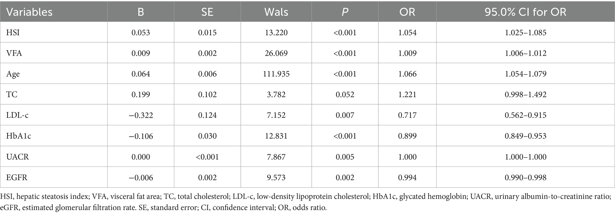 In addition to HSI, our study identified VFA and age as significant risk factors for hypertension in T2DM patients, consistent with prior evidence linking central adiposity and aging to elevated blood pressure (31). Increased VFA reflects greater visceral adiposity, which promotes insulin resistance, dysregulated adipokine secretion, and systemic inflammation, thereby impairing blood pressure regulation (32). In T2DM patients, excessive visceral fat not only contributes to hypertension but also amplifies the risk of diabetes-related complications (33, 34), highlighting the importance of comprehensive metabolic assessment and targeted intervention in this population.