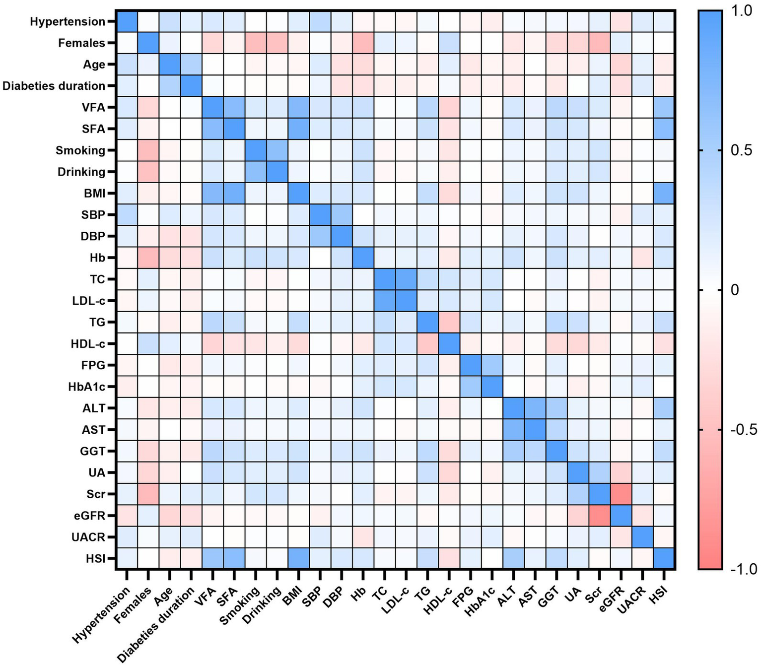 Table 1 displays the clinical and biochemical characteristics of the study population. Patients were categorized into a non-hypertensive group (n = 1,140) and a hypertensive group (n = 604). Compared with non-hypertensive patients, those with hypertension were older, had a longer diabetes duration, and exhibited higher BMI, SBP, DBP, VFA, and SFA (all p < 0.001). In contrast, FPG and HbA1c levels were significantly lower in the hypertensive group (p = 0.001 and p < 0.001, respectively). With respect to lipid profiles and liver and kidney function, hypertensive patients demonstrated higher LDL-c, AST, GGT, UA, Scr, UACR, and HSI (all p < 0.05), along with reduced eGFR (p < 0.001). No significant differences were found in sex distribution, smoking and alcohol consumption, TC, HDL-c, or ALT between the two groups (all p > 0.05).