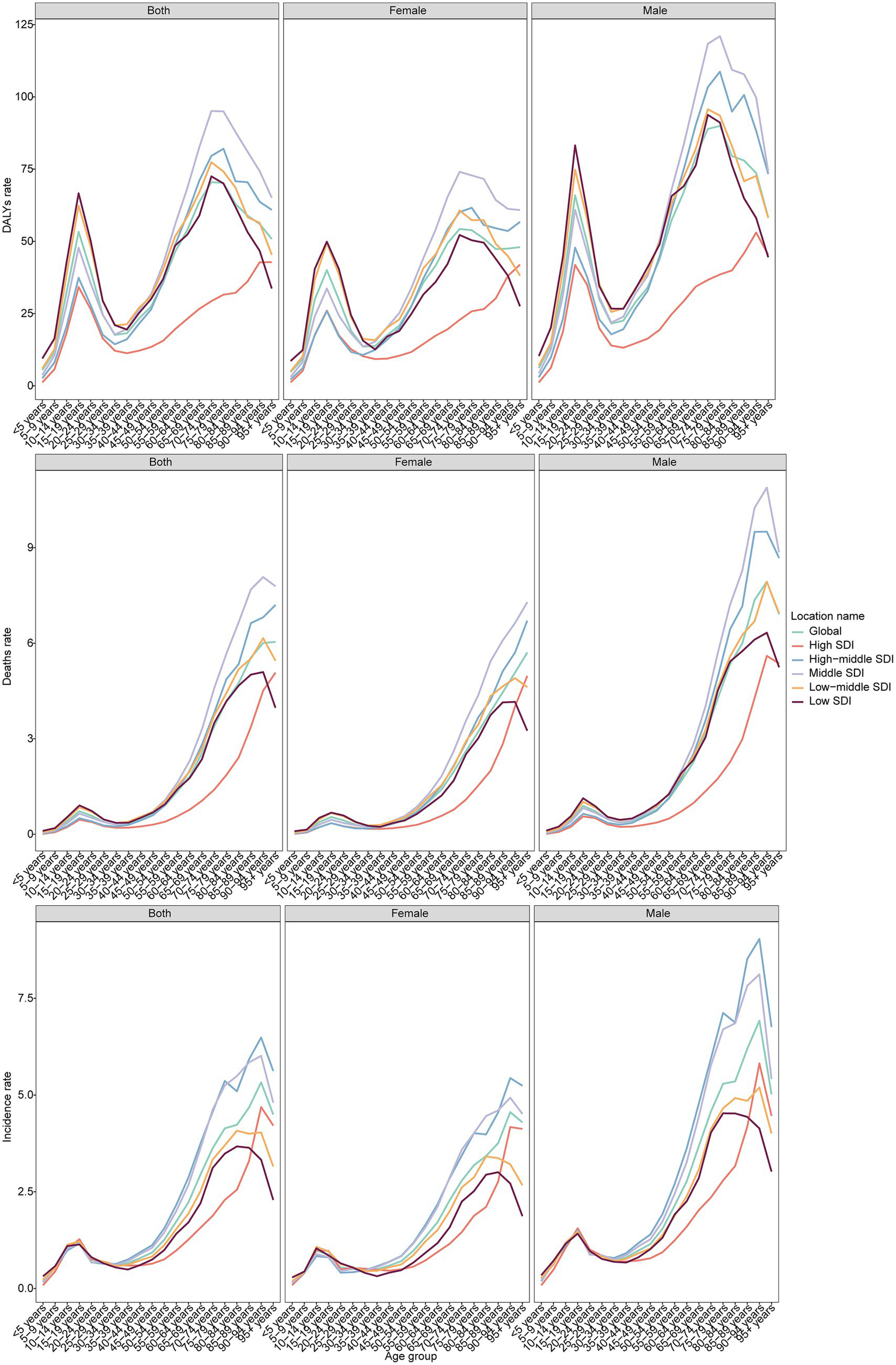 The DALYs, deaths, and incidence rate of MNBAC across different age groups and genders in global and 5 SDI regions in 2021.