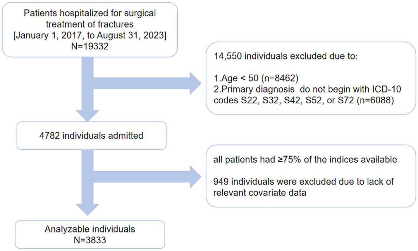 We conducted a cohort study spanning from January 1, 2017, to August 31, 2023. It initially enrolled 19,332 patients who were treated for fractures at the First People’s Hospital of Kunshan. From this group, 8,462 patients under the age of 50 were excluded. A total of 4,782 patients with OPFs who underwent inpatient surgical treatment were included in the study. Patients with diagnoses corresponding to ICD-10 codes S22, S32, S42, S52, or S72, based on the International Statistical Classification of Diseases and Related Health Problems, 10th Revision, were selected. Blood tests were performed for all patients during their hospitalization. Blood samples (in fasting condition) were collected, and all clinical parameters were assessed within 3 days of admission. OP was diagnosed based on fractures and skeletal instability in the absence of bone metabolic disorders or a standard bone mineral density (BMD) T-score of −2.5 or lower, even in the absence of fractures (33). Data for ≥ 75% of the 30 indicators required for FI assessment, equivalent to at least 22 indicators (32), were available for all included patients. A total of 949 patients were excluded due to missing data on other covariates (As shown in Figure 1).