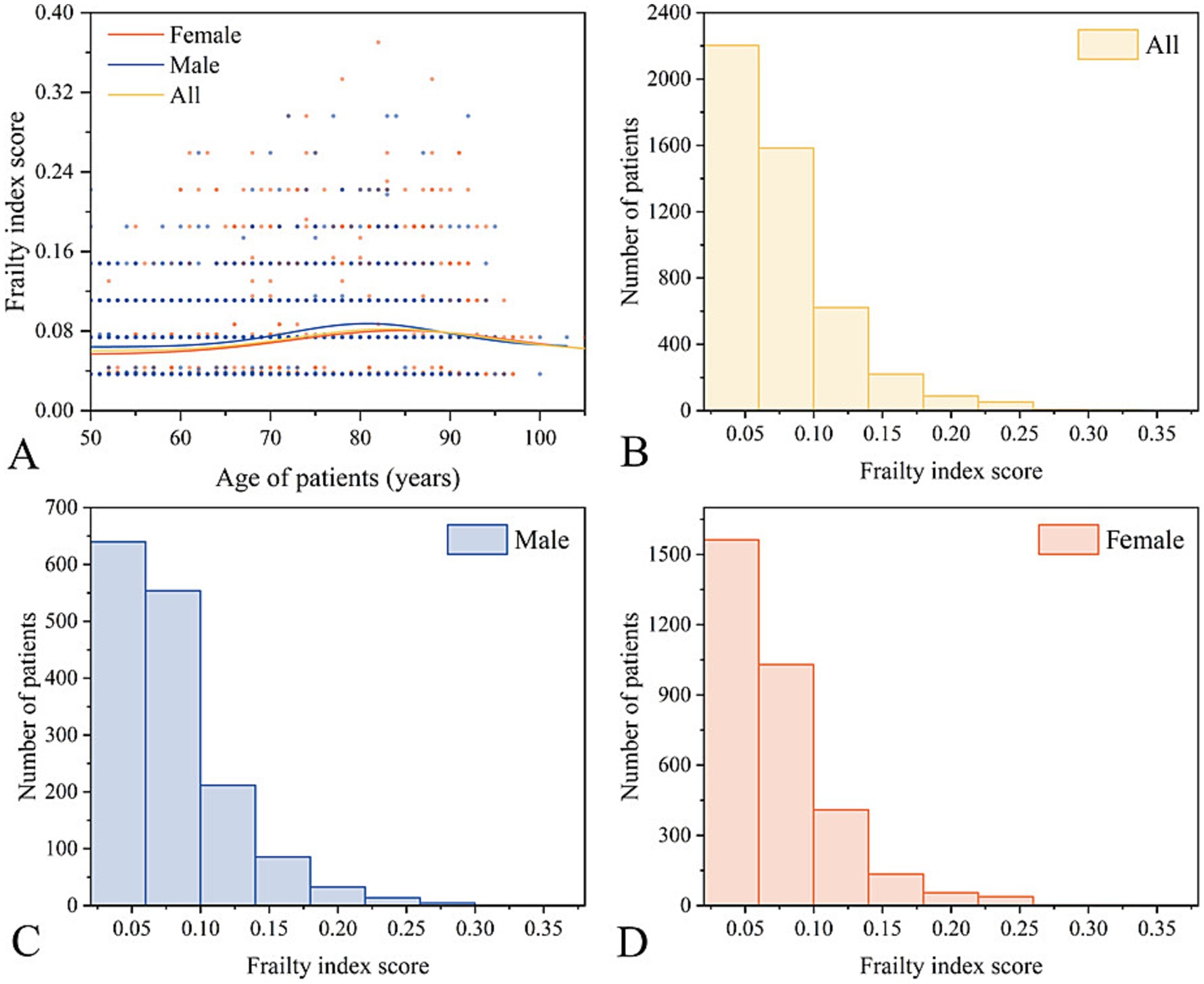 Figure 2 illustrates the distribution of FI values, with most values clustered < 0.10. The mean FI for all participants was 0.07 ± 0.04. The FI levels of male and female patients were similar, indicating a weak correlation between FI and age and an approximated overall mean level. A total of 577 patients (12.07%) had passed away by the end of the follow-up period.