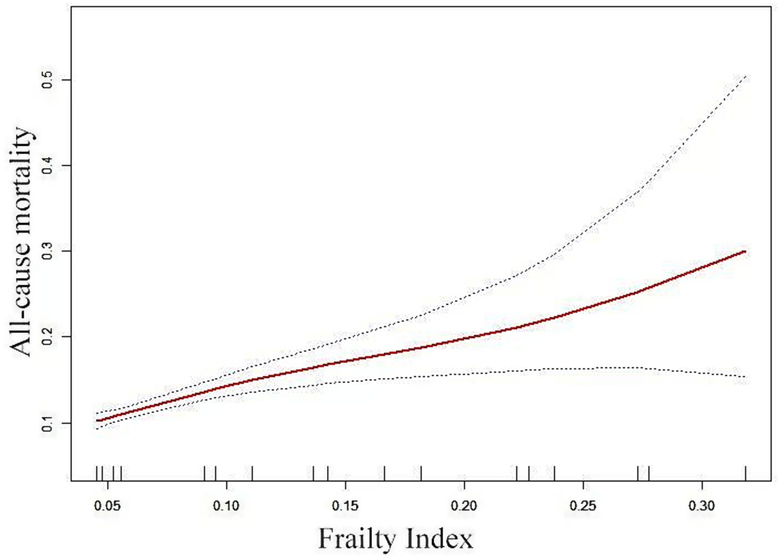 Results: Among the 3,833 patients, the mean age was 68.77 years, with an average FI of 0.07. A substantial positive correlation was observed between FI and ACM (HR = 1.05, 95% CI: 1.03–1.07, p < 0.01). Importantly, a 0.033 increase in the FI score (equivalent to ~ 1 additional cumulative deficit) was related to a 17% higher risk of ACM (HR: 1.17, 95% CI: 1.10 to 1.24). Subgroup analyses further validated these findings across diverse demographic groups.