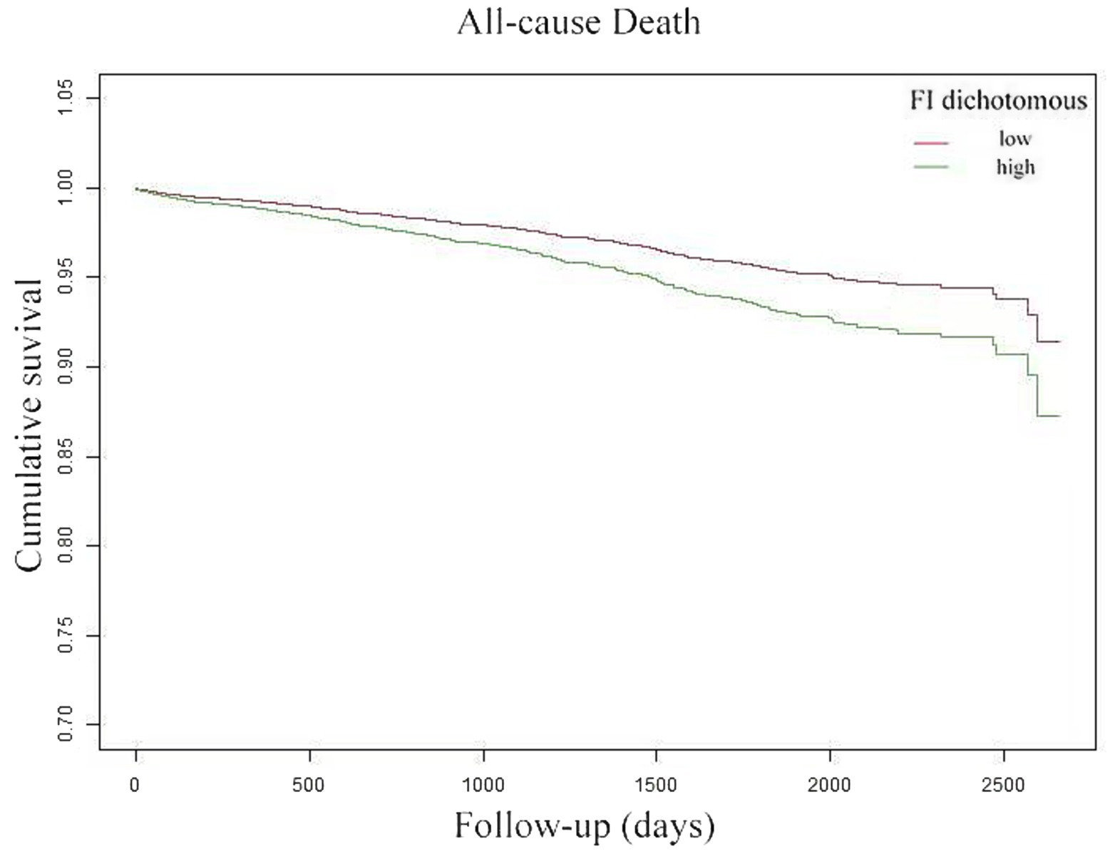Figure 4. Kaplan–Meier curves reflected the cumulative survival of patients with high FI (green line) and patients with low FI (red line).