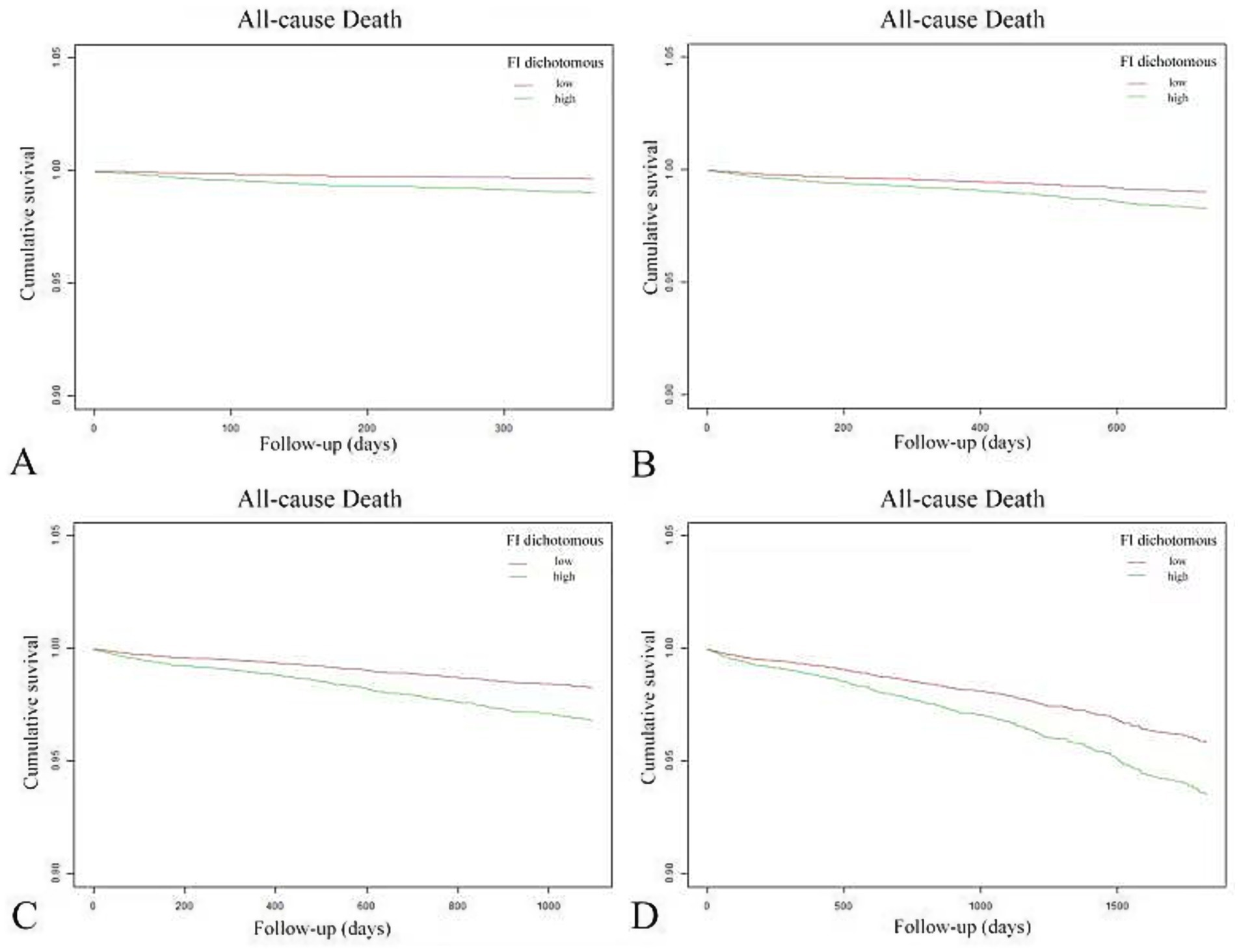 Figure 5. Variable sensitivity analysis of Kaplan–Meier curves for cumulative survival in patients with high FI (green line) and low FI (red line). Panels (A–D) correspond to follow-up periods of 1, 2, 3, and 5 years, respectively.