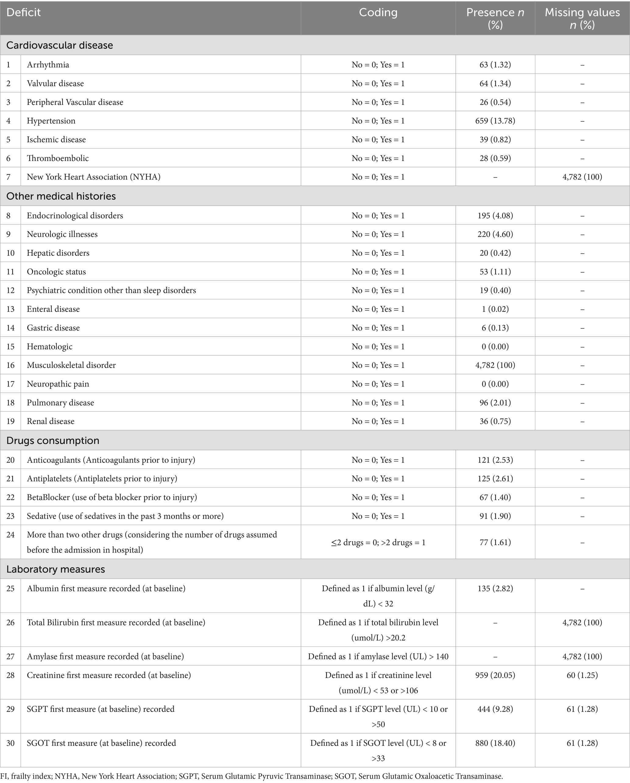 The construction of the FI was based on the methodology established by Galimberti et al. (32). It incorporated 30 variables that reflected the extent of pre-fracture comorbidities, pre-fracture medication use, and post-admission laboratory results. The final FI required the availability of at least 75% of these variables for each individual to maintain its comprehensive assessment. For each item, a score of “0” was assigned if deficits were absent, and a score of “1” indicated the presence of deficits. Abnormal laboratory values were determined based on reported laboratory reference ranges. The cumulative deficit count divided by the non-missing item numbers yielded a standardized score (ranging from 0 to 1, where 0 signifies no frailty and 1 represents complete frailty) (32).