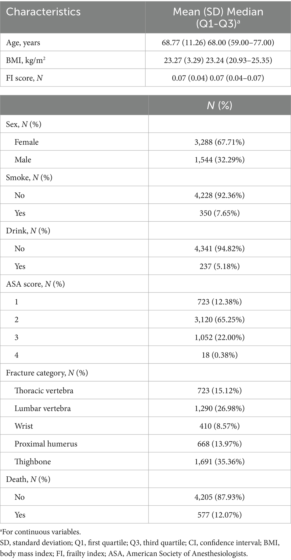 Table 1 summarizes the process of constructing the FI. Table 2 presents the overall characteristics of the study cohort. The mean age of patients was 68.77 ± 11.26 years (interquartile range: 59.00–77.00 years). The participants were mostly females (n = 3,288, 67.71%), while males accounted for 32.29% (n = 1,544) of the sample. The mean BMI was 23.27 ± 3.29 kg/m2 (interquartile range: 20.93–25.35 kg/m2).