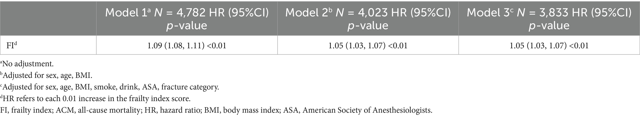 A total of 3 models were employed to examine the relationship between FI and ACM in OPFs (Table 3). In the unadjusted Model 1, a remarkable correlation between FI and ACM was observed (HR = 1.09, 95% CI: 1.08–1.11, p < 0.01). Model 2, which adjusted for age, gender, and BMI, demonstrated consistent findings, with FI remaining considerably correlated with ACM (HR = 1.05, 95% CI: 1.03–1.07, p < 0.01). In Model 3, after adjustments for smoking, alcohol consumption, ASA score, and fracture type, a persistent, substantial positive association between FI and ACM was found (HR = 1.05, 95% CI: 1.03–1.07, p < 0.01). (HR corresponds to the effect of each 0.01 increase in the FI score).