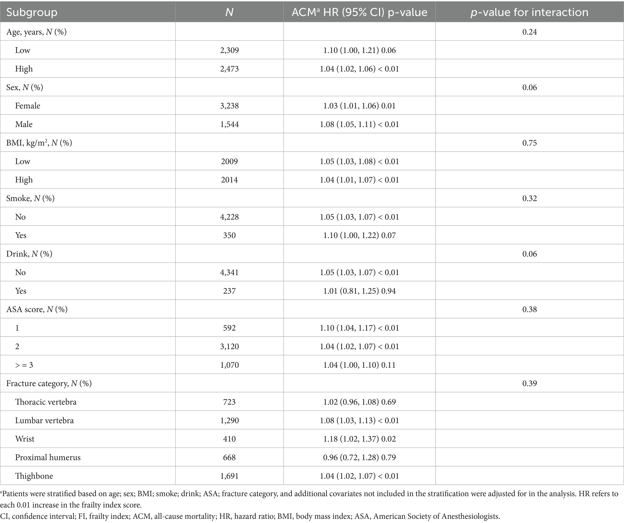 Methods: This retrospective cohort study included 19,332 patients who underwent surgical treatment for fractures at Kunshan First People’s Hospital between January 1, 2017, and August 31, 2023. Among these, 4,782 patients aged ≥ 50 years were diagnosed with OPF. The FI was developed based on 30 health indicators, and it requires the availability of at least 75% of the variables for all patients. Moreover, ACM was monitored from the time of hospitalization until death or the end of the study period. Data on the correlation between FI and ACM were statistically evaluated, including the Cox proportional hazard regression model, interaction test, smooth curve fitting, K-M survival curve, threshold effect, subgroup, and sensitivity analyses.