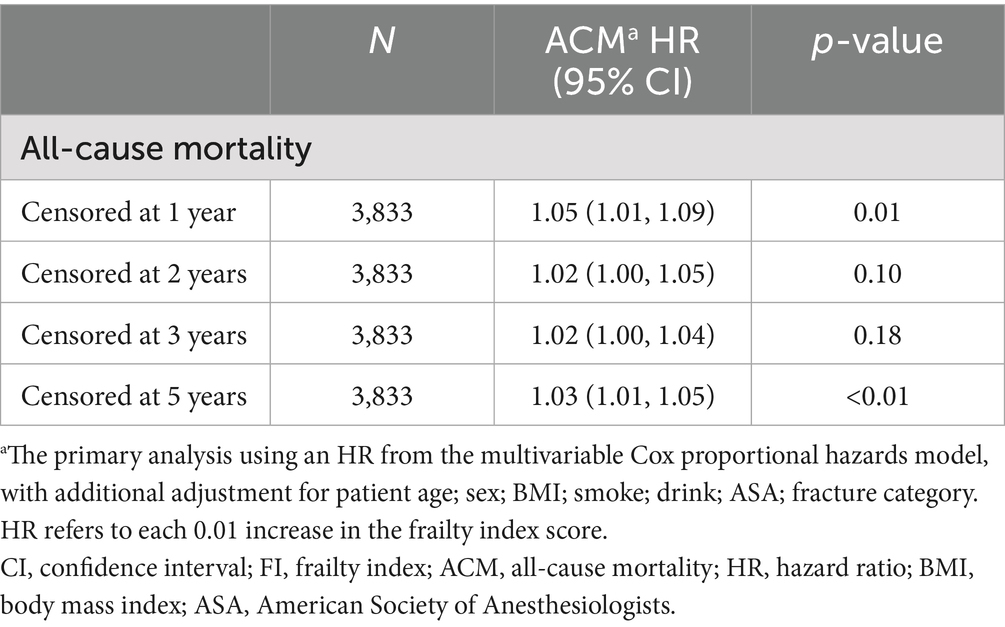 Continuous data regarding patient demographics and clinical characteristics are depicted as mean ± standard deviation (SD) or median [1st quartile (Q1) to 3rd quartile (Q3)]. Normally distributed data were compared via independent two-tailed t-tests, while non-normally distributed data were analyzed using the Mann–Whitney U test. Categorical data are expressed as frequency (%), with variances evaluated via chi-squared tests. When the assumptions for the chi-squared test were not satisfied, the Fisher exact test was applied as an alternative. Cox proportional hazard regression models were used to assess the association between FI and ACM. The initial multivariate analysis comprised patient age, gender, BMI, alcohol consumption, smoking status, ASA score, and fracture type. A smooth curve fit was applied to generate a plot illustrating the correlation between FI and ACM. Moreover, Kaplan–Meier (K-M) survival curves were constructed to represent patient outcomes. Furthermore, subgroup analyses were conducted based on patient gender, age percentiles, BMI, smoking and drinking habits, ASA score (1, 2, ≥3), and fracture categories. The study also used likelihood ratio tests (LRT) to compare subgroup modifications and correlations. In the sensitivity analysis, follow-up times of 1, 2, 3, and 5 years were used, and K-M curves were generated for each time point to evaluate whether variations in follow-up duration influenced the relationship between FI and ACM in patients.