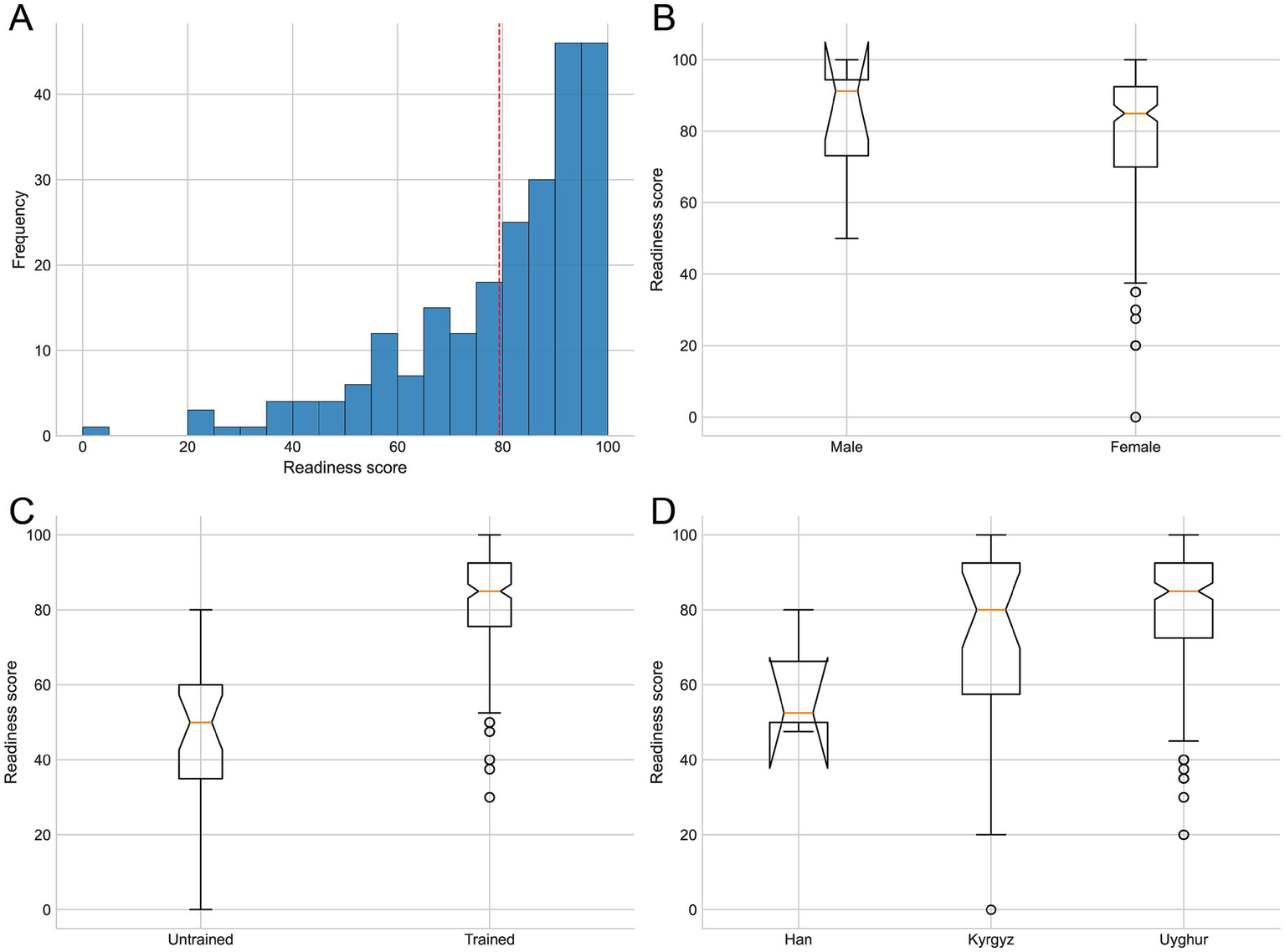 Categorical variables were summarized using counts and percentages, while continuous variables were described with means and standard deviations and with medians and interquartile ranges as supplementary descriptors. Baseline comparisons between the trained and untrained participants were performed using chi-squared tests for categorical variables, Fisher’s exact test for sparse 2 × 2 tables, and the Kruskal–Wallis test for continuous variables. To assess group differences in readiness and strict overall accuracy for single-choice variables, the Kruskal–Wallis test was used and, when significant, the pairwise Mann–Whitney U test with Benjamini–Hochberg false discovery rate (FDR) adjustment was conducted. Item-level accuracy across subgroups (training status, gender, ethnicity, age group, education, and marital status) was compared using chi-squared or Fisher’s exact tests (Supplementary Table 1).