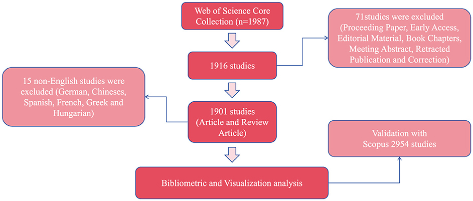 Using the aforementioned search strategy, a total of 1,987 literatures were initially retrieved. After excluding 71 records of non-target document types—including Proceeding Papers, Early Access articles, Editorial Materials, Book Chapters, Meeting Abstracts, Retracted Publications, and Corrections—only 1,916 documents (comprising Articles and Review Articles) were retained. Subsequently, 15 non-English articles were further excluded, including six German-language, four Chinese-language, two Spanish-language, one French-language, one Greek-language, and one Hungarian-language records. This resulted in a final set of 1,901 English-language articles. All selected records were exported in the “Full Record and Cited References” format, encompassing 1,426 Articles and 475 Review Articles. The same inclusion and exclusion criteria were applied in the Scopus database, ultimately yielding 2,954 articles, consisting of 2,222 research articles and 732 review articles (Figure 1).