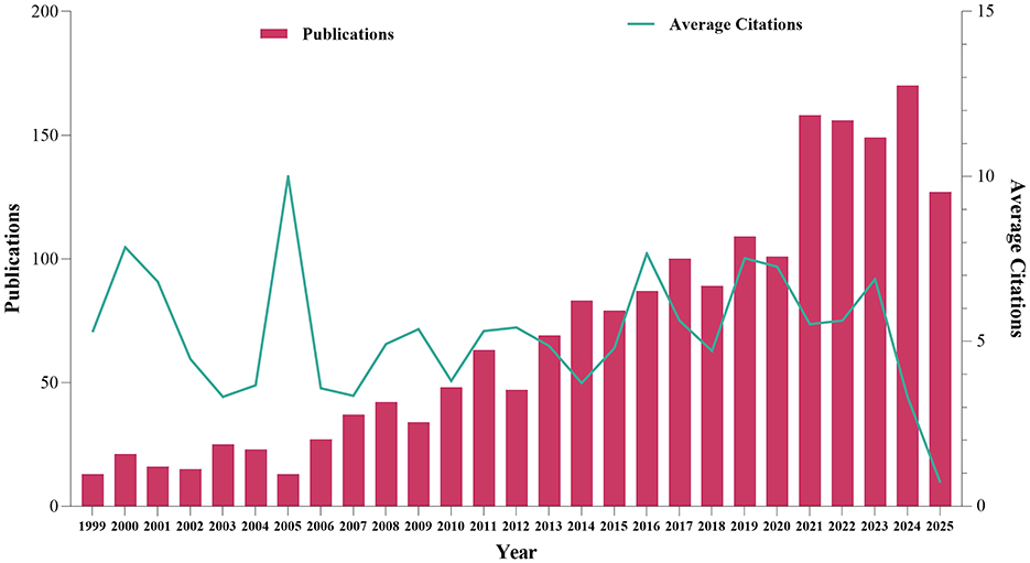 Based on the established search strategy and criteria, a total of 1,901 articles in WOSCC focusing on mechanoimmunology were finally included, covering the time period from 1999 to 2025. The overall number of published articles showed a steady upward trend over this period. Notably, the largest year-on-year growth (56.44%) was observed in 2021, and the highest annual publication volume of 170 articles was reached in 2024. The same trend was also observed in the Scopus database, with sequential growth rates of 23.21 and 21.26% recorded between 2020 and 2021, representing the highest levels in history. Additionally, the number of published articles reached a peak of 261 in 2024 (Supplementary Table S1). This upward trajectory indicates that research in the field of mechanoimmunology has now entered an active phase. Interestingly, although only 13 articles were published in 2005—far fewer than the peak in later years—this year exhibited the highest average annual citation count of 209.77 citations per article in WOSCC. This observation suggests that 2005 may have witnessed the publication of either a single high-impact study or multiple influential works that have continued to shape subsequent research in this domain (Figure 2).